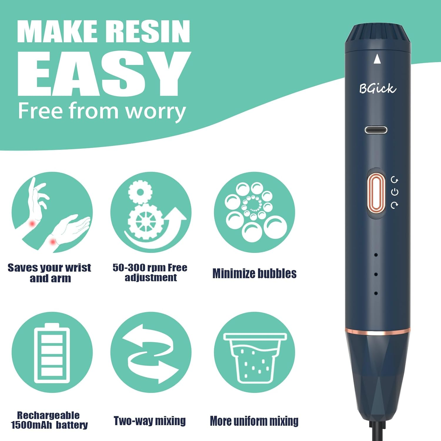 【Epoxy Resin Mixer】Save Your Wrist and Save Your Time, The speed is controlled at 50-300 RPM. Even if the speed reaches the maximum, it will not produce a lot of bubbles 【Upgrade motor and two-way mixing】 The use of a larger torque motor to avoid stirring the more viscous resin caused by the stoppage of work, torque of up to 200, and the use of a larger torque motor. is equipped with forward and reverse modes to meet your mixing needs 【Rechargeable Stirrer】BGick resin mixer tool is rechargeable, 1500mah large-capacity battery, equipped with USB data cable, The red light above is always on when charging, the bottom turns blue after 4-6 hours of charging 【Easy to Clean】with 4 reusable, high quality epoxy mixing paddles and are easy to clean. You can wipe with baby wipes and then wash the paddle with warm water. Or you can peel the epoxy off the paddle after the epoxy has dried 【What You Will Get】1x Rechargeable Electric Resin Mixer, 4 epoxy resin stirring paddles (2*small 2*large), 1x USB Type-C Charging Cable, 1x Instruction Manual Product Description Epoxy Resin Mixer It provides a more convenient, comfortable operating experience when using it, and is great for mixing resins, saving your wrists and reducing more air bubbles. FULL UPGRADE It adopts new high power motor, two-way mixing, stepless speed change, 1500mah battery. The video showcases the product in use. The video guides you through product setup. The video compares multiple products. The video shows the product being unpacked. Multi-scenario application It can not only mix epoxy resins, acrylic resins, pigments, paints, etc., but can also be used as a mixing agent.
