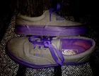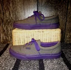 Elevate your shoe game with these stylish VANS Authentic sneakers for women. These shoes feature a sleek gray color with purple accents, including lace-up closure with eyelets and the iconic VANS logo. The canvas upper material provides a comfortable and breathable fit, while the cushioned foam insole and rubber outsole offer superior comfort and traction. These low-top sneakers are perfect for any occasion, whether it's for walking, school, or skateboarding. The VANS Authentic sneakers are a must-have addition to any wardrobe, combining a classic design with a colorful and athleisure theme.