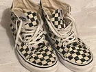 These VANS shoes are high-top sneakers in black with a white checker pattern. They feature a lace-up closure, rubber outsole, and comfortable foam insole. Suitable for skateboarding, the shoes are designed for both men and women in a standard shoe width. The upper material is cotton blend, making them breathable and adjustable for a variety of activities.