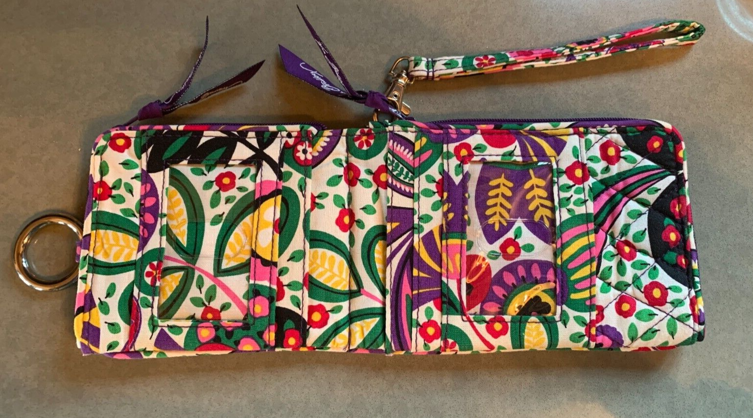 New without tags, mint condition! Bright Vera wristlet wallet in a diamond-quilted multicolor paisley with purple lining. Shiny chrome accents. Hidden magnetic closure opens bifold wallet to reveal two clear pocket slots for ID, and multiple flat compartments for credit cards, cash. etc. Double zippers with flag tags featuring the designer's name. Adorable vinyl crabby key fob is attached, or this accessory can be used separately. Handy loop for wrist. Measures 6" x 4"; 11" when opened. Crab fob is 3" x 3" Fast shipping, quality packed, smoke-free household, trackable. Thanks for looking :)