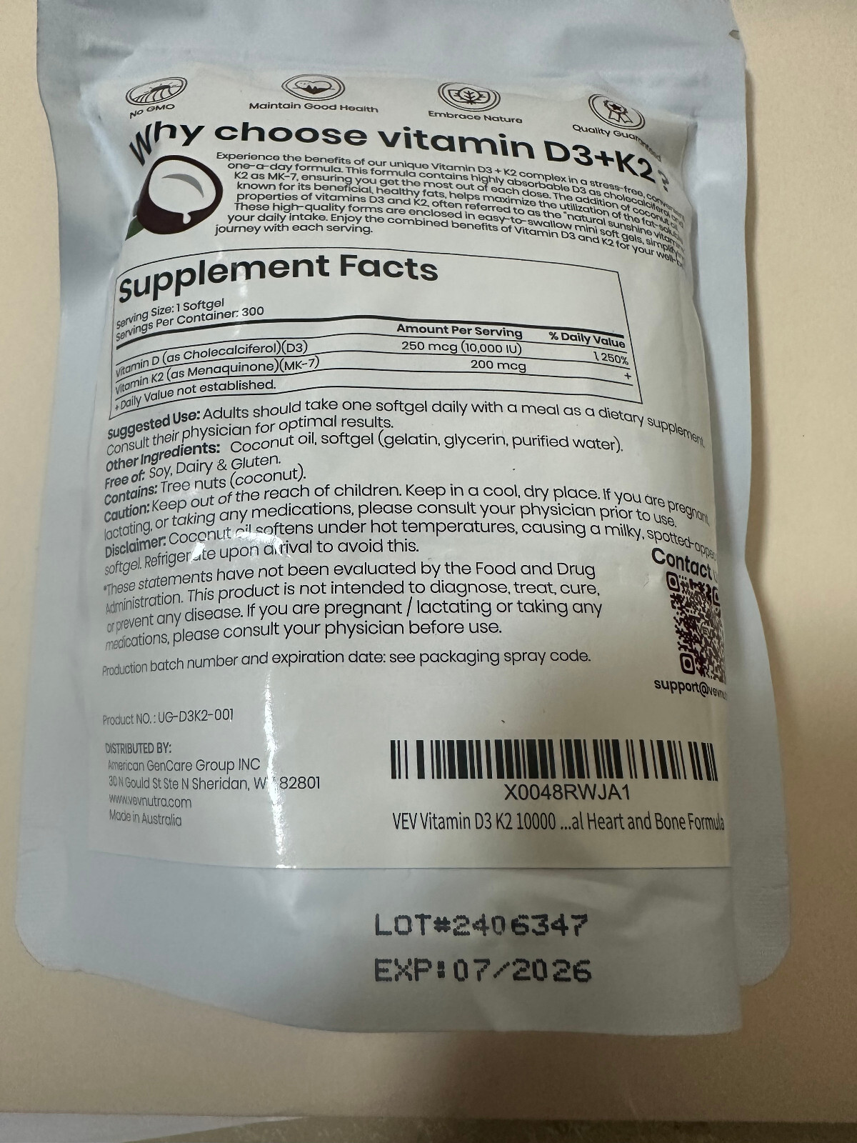 Brand New/Never Opened as packaged by manufacturer VEV Vitamin D3 + K2 10,000 IU + 200 mcg 300 soft gels expires 07/2026 Items will be shipped within 24 business hours of payment