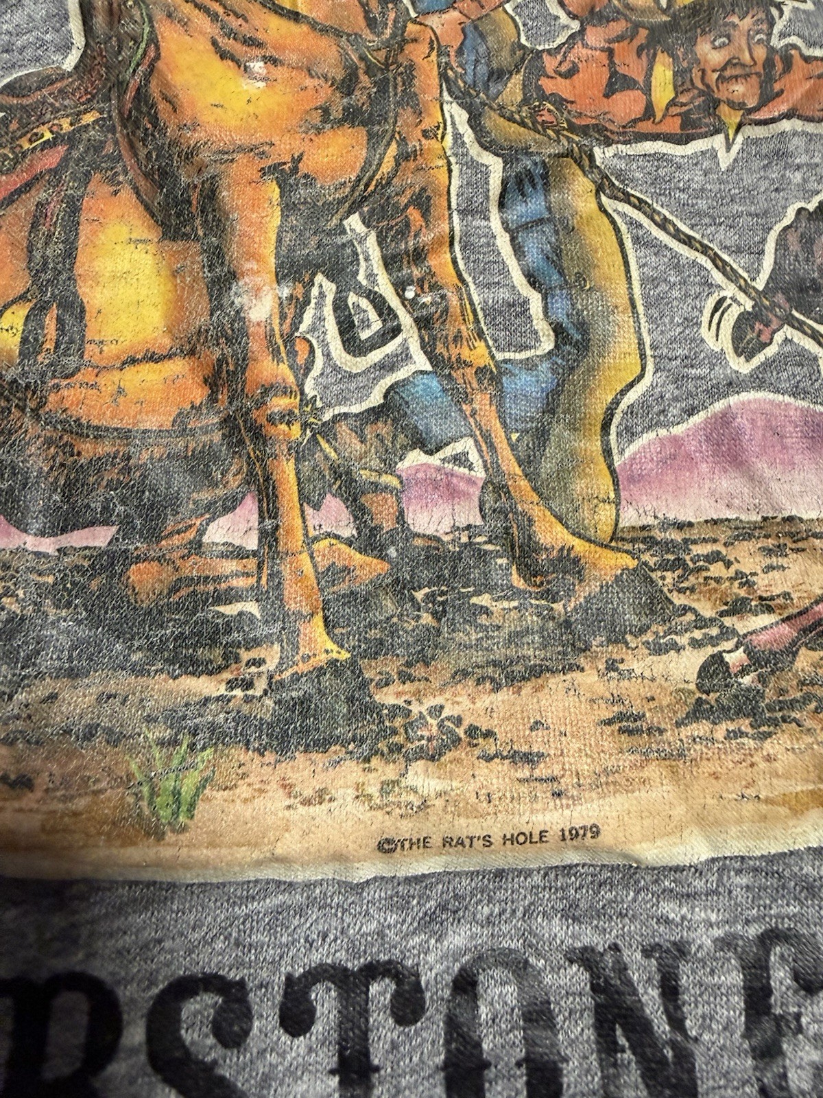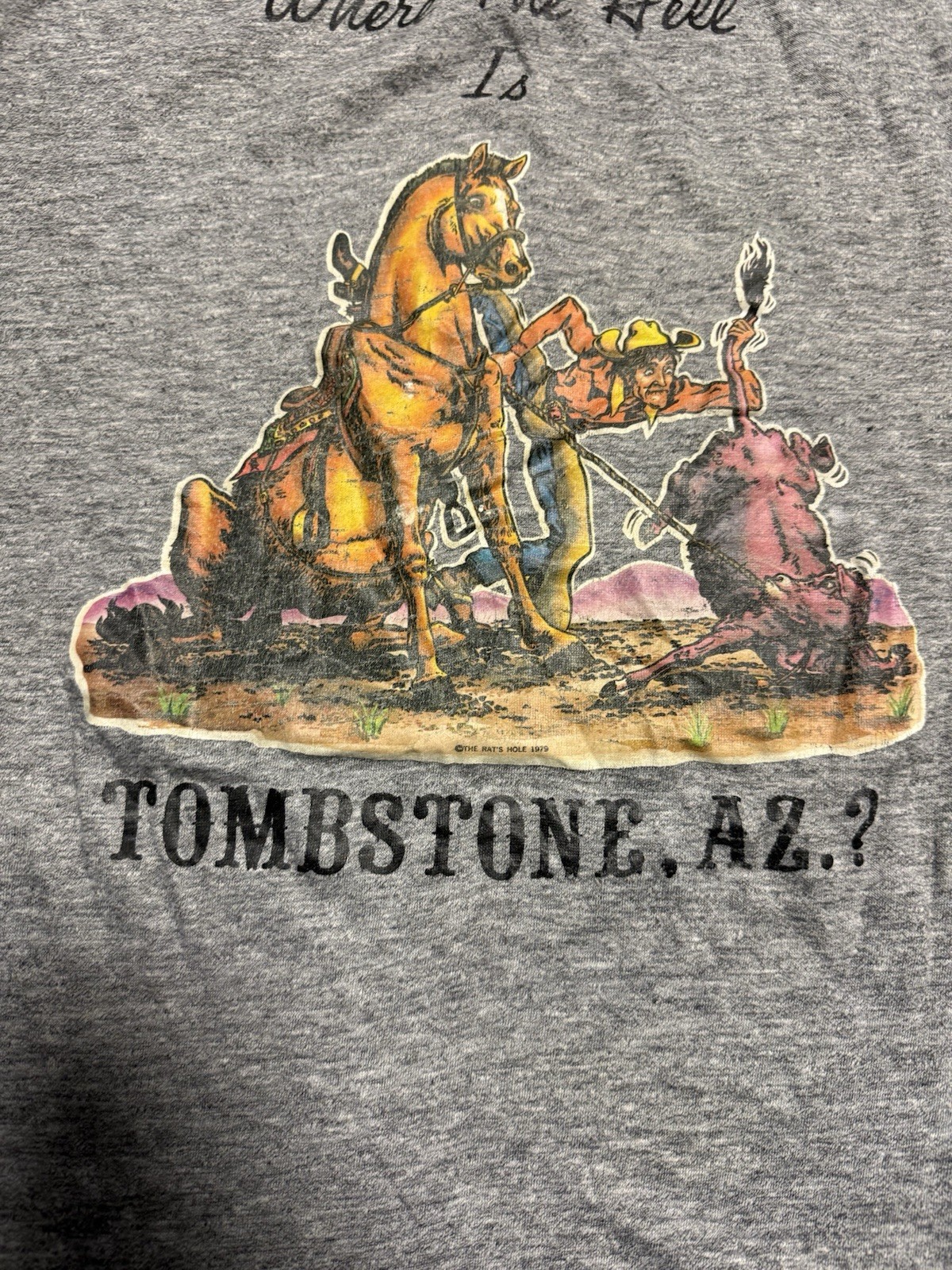 This vintage 70s Tombstone Arizona souvenir T-shirt by Thunder is a stylish and unique find for men size Large. The shirt features a graphic tee style with a classic short sleeve design, made of comfortable cotton material in a gray color. With its original 1970s print, this shirt is a nostalgic piece that showcases a bit of American history and is perfect for collectors or those looking to add a touch of retro flair to their wardrobe. Cracking on graphic