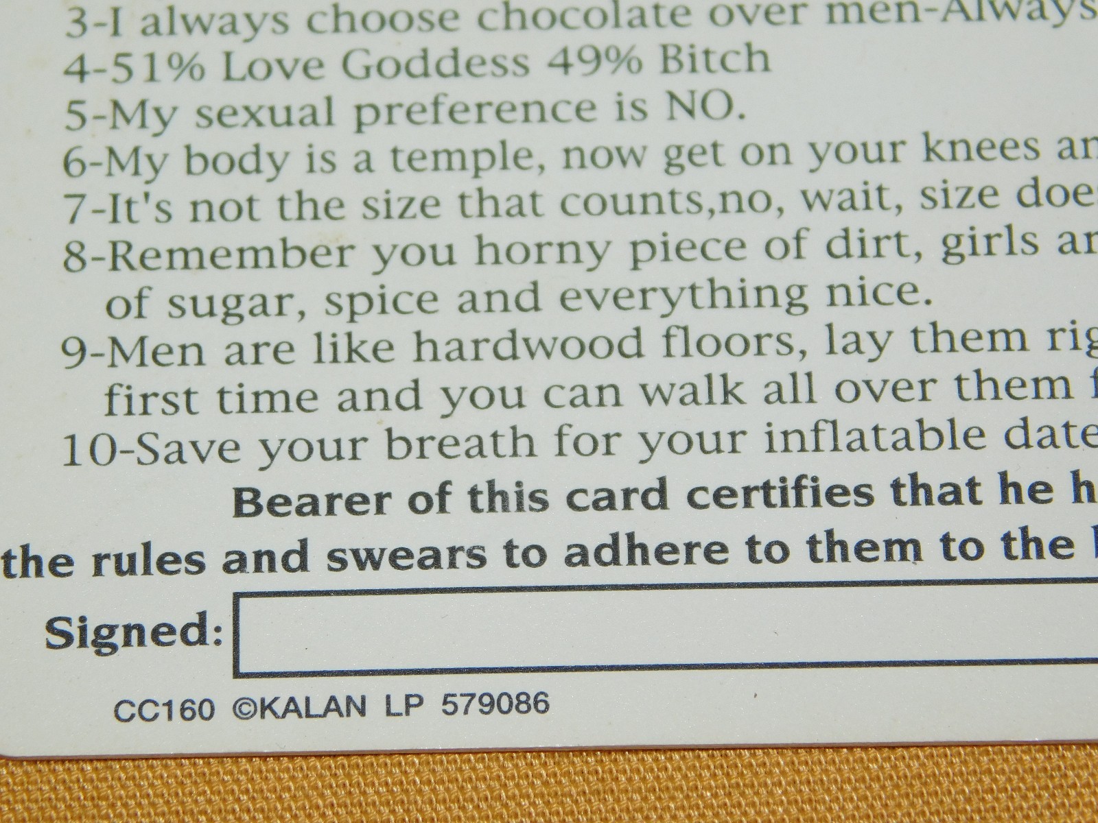 YOU ARE BIDDING ON...... . . VINTAGE NOVELTY GAG GIFT COOL MEN PLEASE READ RULES BEFORE PROCEEDING CARD.. .. .. ..PLASTIC.... MEASURES APPROX 3 3/8" X 2 1/8"........ SHOWS SOME HANDLING/ AGE WEAR..........PLEASE VIEW PHOTOS FOR CONDITION.***PLEASE E-MAIL IF YOU HAVE A QUESTION OR WANT AN ADDITIONAL PICTURE....PLEASE VISIT MY EBAY STORE FOR ADDITIONAL VINTAGE ITEMS..THANK YOU*** 12P-8765-XXXX