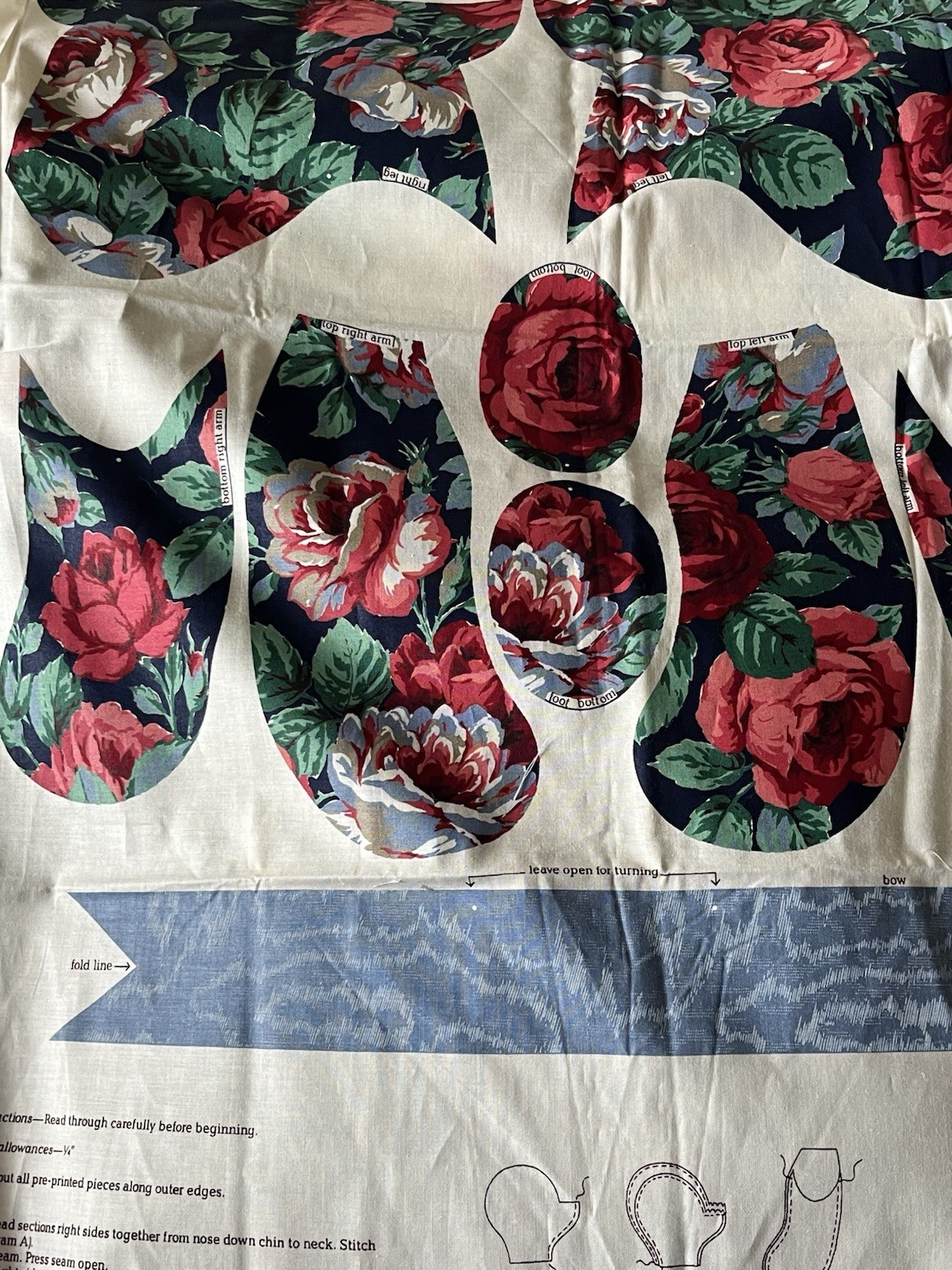 Beautiful vintage Cranston VIP Rose Cut N Sew Bear. The back ground is A dark navy almost looks black with roses through out. Part of my collection of vintage fabrics. This is A larger panel. Please see the photos for this shabby chic cottage bear. He or she is going to be adorable when finished! Any questions please ask thanks. Fabric is vintage in like new condition comes from smoke free home.