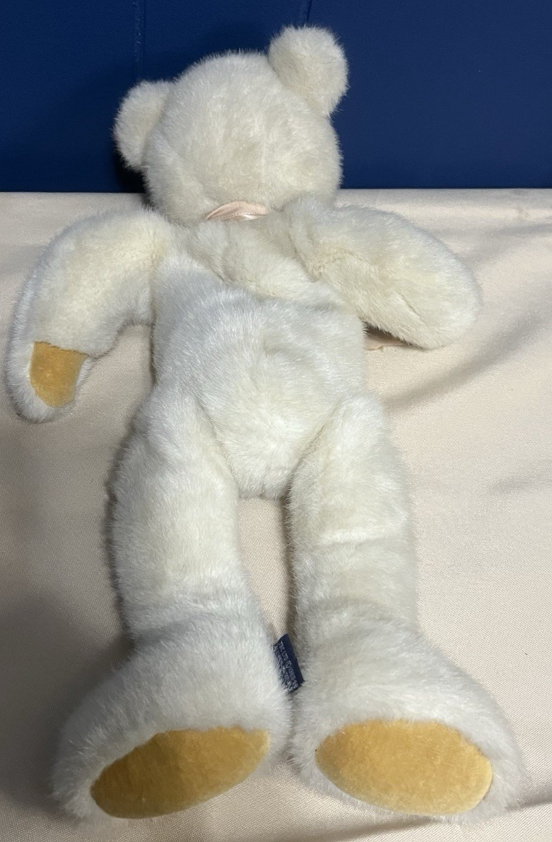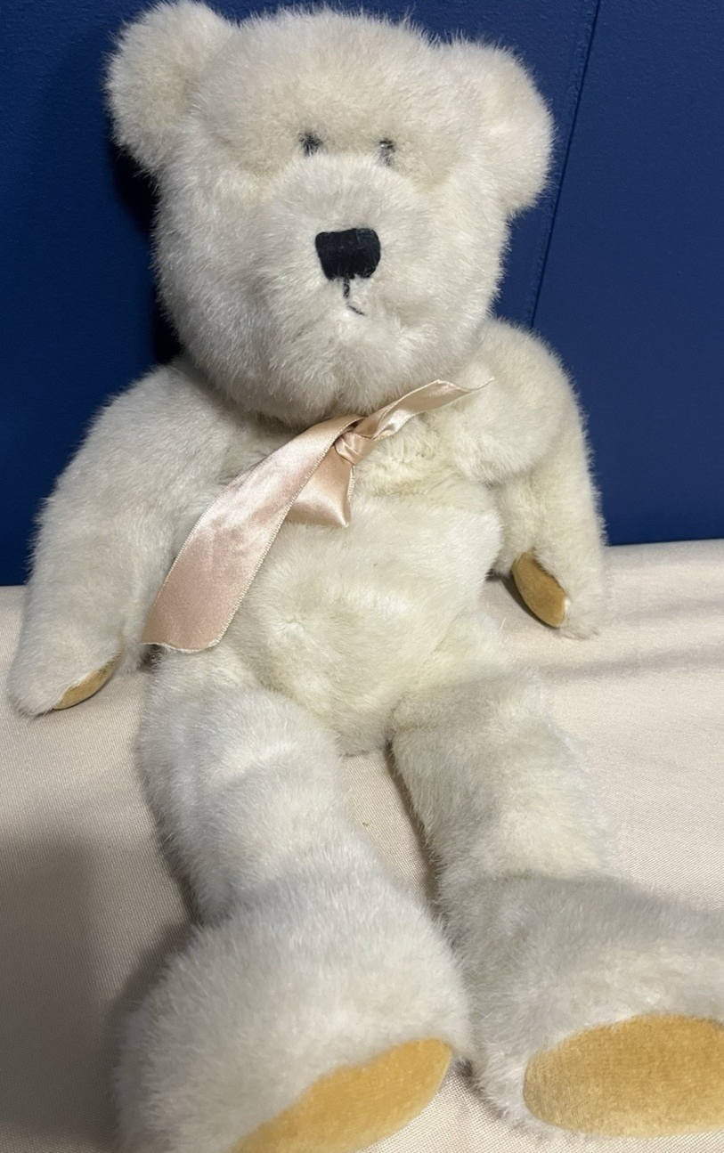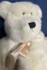 The product is a vintage 1985 Boyd's Collection stuffed bear featuring a beige color with a peach bow. This 17-inch plush bear is designed with black eyes and is part of the Teddy Bear theme. The bear is a retired collectible from the 1980s and comes without packaging. Created by artist Jody Battaglia, this retro plush bear is a charming addition to any collection or for those who appreciate nostalgic 80's items.