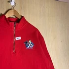 This vintage Walt Disney World sweater is a red, extra-large men's pullover featuring an embroidered Mickey Mouse logo. Made of cotton knit fabric, it has a tight-knit pattern with a crew neck and long sleeves. The sweater has a 1/4 zip and a classic, hipster style, suitable for various occasions including travel, parties, and workwear. Perfect for Disney enthusiasts, this sweater combines nostalgia with a touch of hipster flair, making it a unique and stylish addition to any wardrobe.