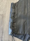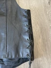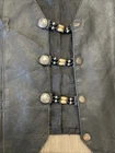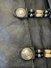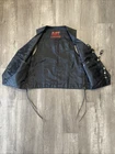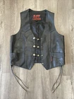 This vintage Hot Leathers black leather vest is a must-have for any biker or motorcycle enthusiast. Made with high-quality leather and featuring a buffalo nickel button closure, this vest is perfect for any occasion, whether you're riding your Harley Davidson or hitting the town. With a classic fit and a range of features including pockets and a limited edition design, this vest is both stylish and functional. The black color and solid pattern make it easy to pair with any outfit, while the polyester lining ensures comfort and durability. Don't miss out on this unique piece, perfect for anyone who loves the motorcycle lifestyle. *missing bottom button*