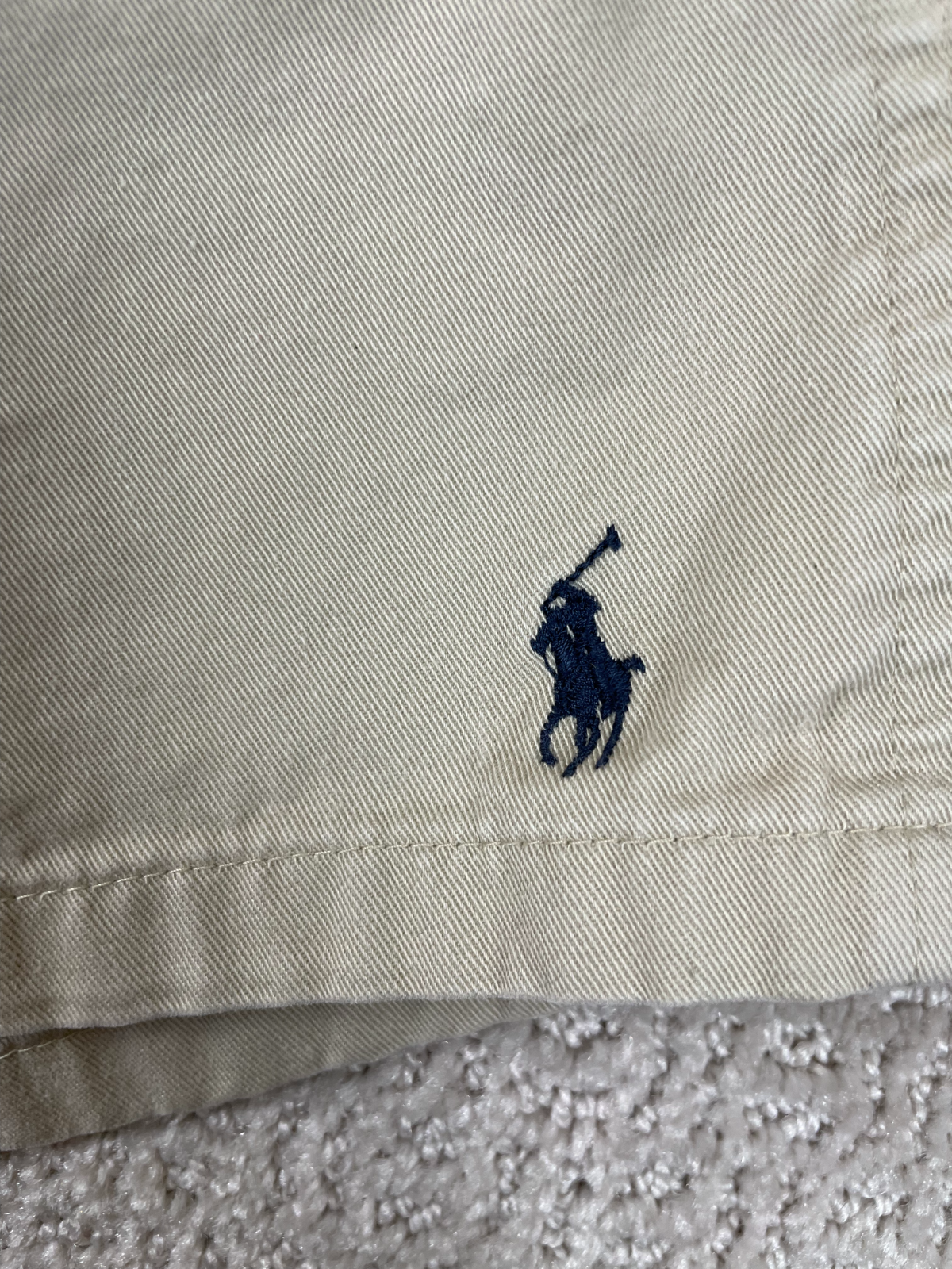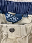 This product is a pair of men's 2XL beige cotton Polo Ralph Lauren chino shorts with an elastic waist. They feature a classic fit, flat front, and slash pockets, making them perfect for casual occasions in the summer or spring. The shorts are machine washable and have a preppy theme, reflecting the brand's style. This timeless wardrobe staple combines comfort and style, with the option to customize the size and style for the perfect fit.