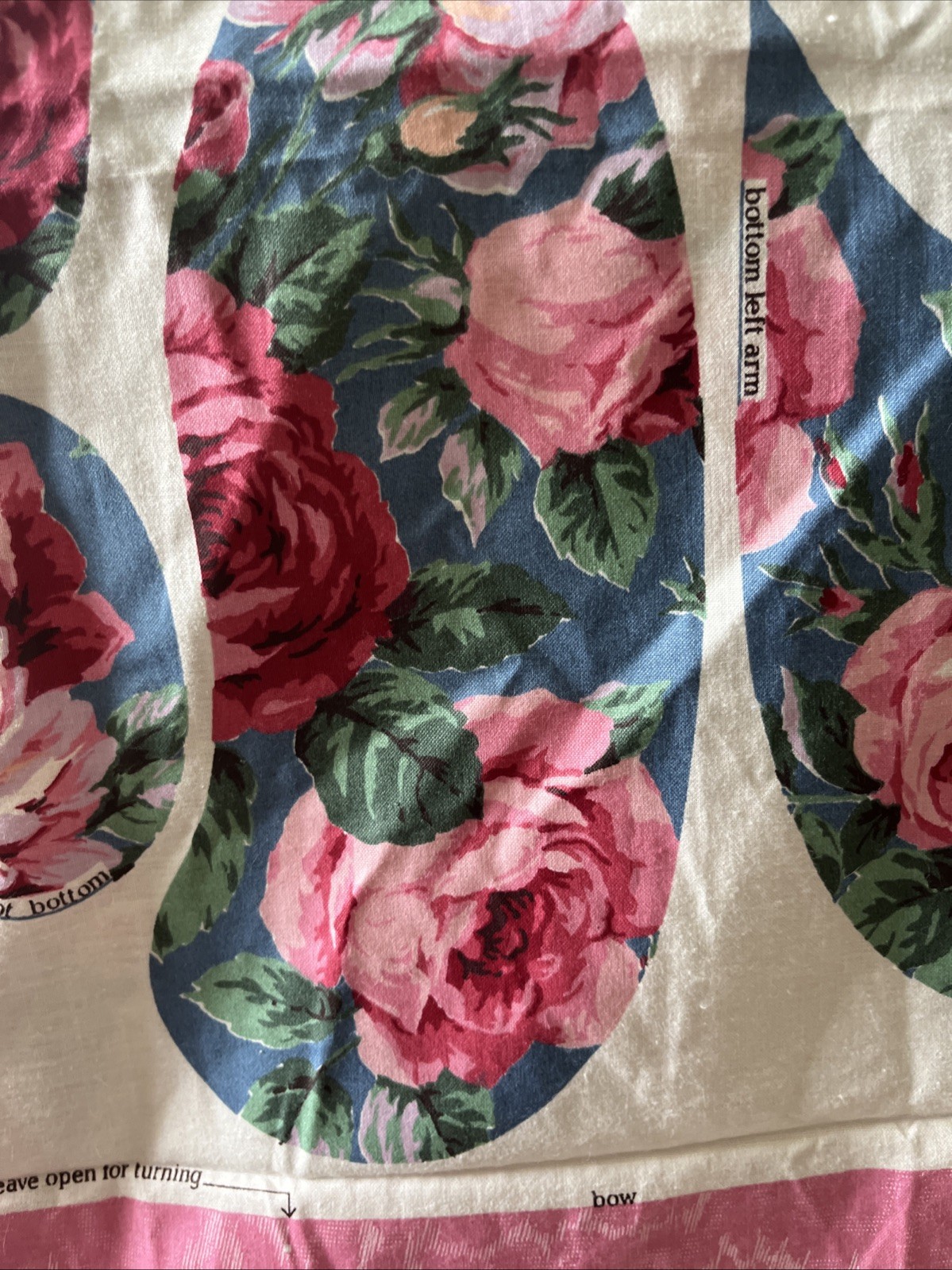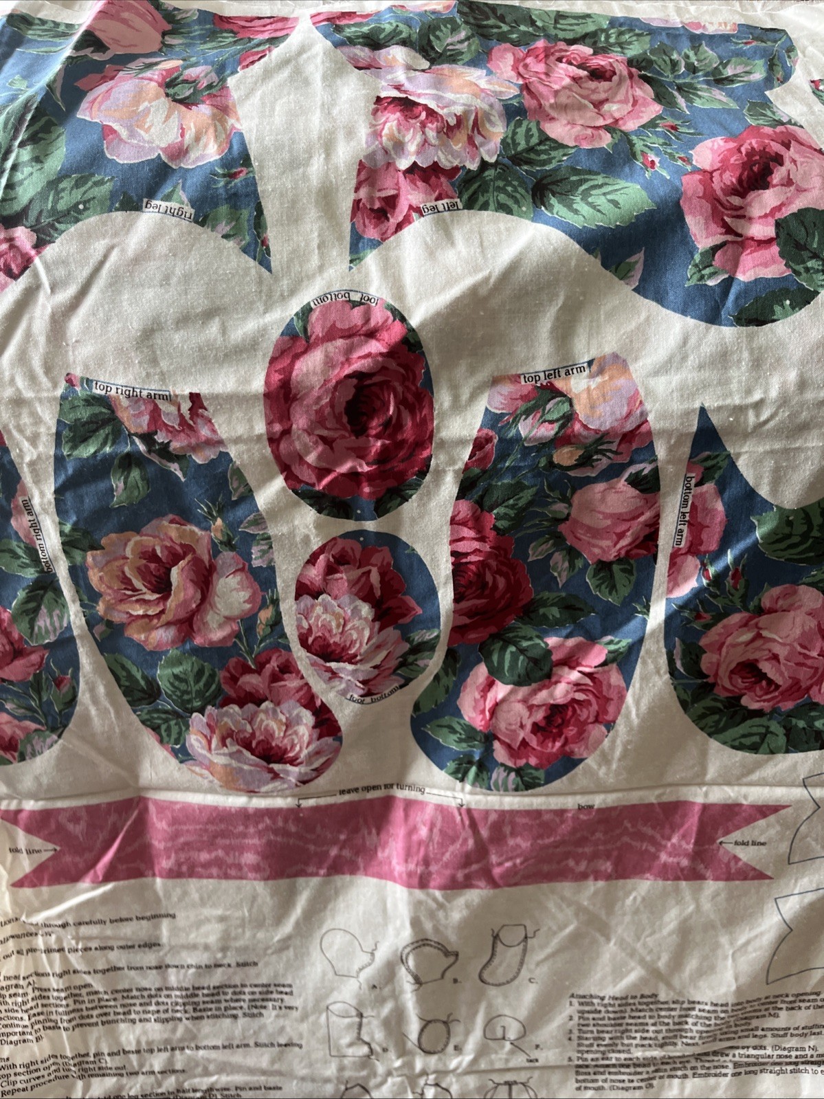 Beautiful colors in this vintage VIP Cranston cut and sew Teddy Bear. Full of Roses! Will be gorgeous when all done up. Shades of pinks blues, a little peach and more shabby chic shades. Please see photos this has been stored for a while there is a little wrinkling on the one small part I am sure there is some prep work before starting these. Would love to make these also “bummer” can’t find sewing lessons so I just keep adding to collection and gotta do A clean out. There are also a couple very small spots on the white again see photos this will not affect your project once cut out. I will be over next couple days doing a major fabric spring clean which will include several other cut n sew dolls and vintage fabric laces will be selling in large lots. So check on back if interested. Any questions please ask thanks.