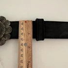 See pictures for measurements. This VTG Women's Black Leather Silver Floral Buckle Western Belt in size L has a vintage flair perfect for goth, grunge, boho, and western styles. The belt features a floral pattern, normal width, and a buckle accent. Made of black leather with a waist size of 35-37 inches, this belt is ideal for adding a touch of nature-inspired, festival, and art vibes to your outfit. Whether you're embracing a hippie, gypsy, rodeo, or cowgirl look, this Sunbelt brand belt is a stylish addition to your wardrobe.