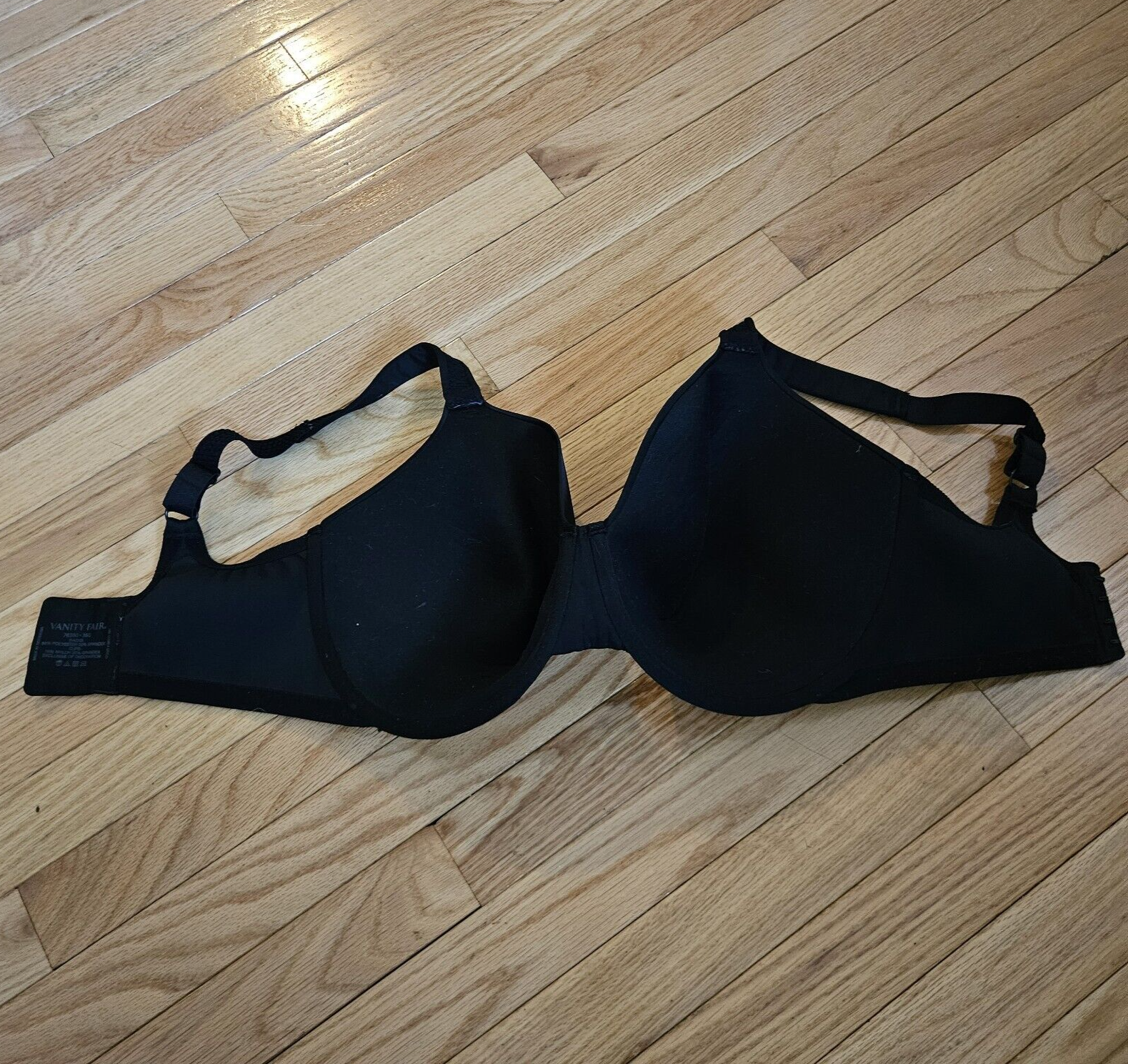 Vanity Fair Black Underwire Bra Style 76380 Good pre-owned condition, no flaws, no signs of wear Back is 80% polyester, 20% spandex, cups are 78% nylon, 22% spandex Light padding in cups 4 hook and eye closures on back strap Marked a size 36G