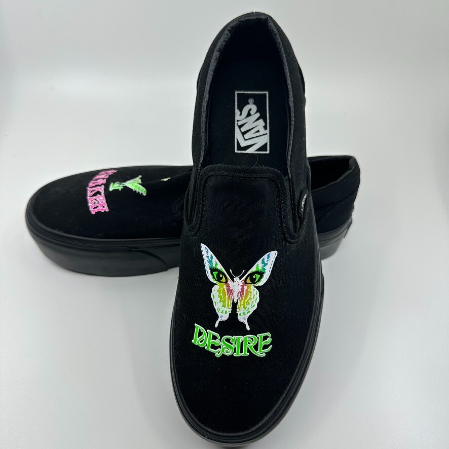 Vans “Awaken Desire” black slip-on sneakers • “Awaken Desire” lettering on midsole • US Men’s size 8.5 / Women’s 10 • New, unworn. No original box included. No tags. Ships quickly and carefully packed! - All sales are final. Returns are only accepted if the item arrives significantly different from the description. Please review all photos and read the full description carefully before purchasing. Feel free to reach out if you have any questions. Thanks for supporting small business! -7 ★ Finds