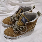 Everything looks close to new including the soles, tan material and the faux . The white rubber could use some dishwashing liquid with a toothbrush. It doesnt look lke these shoes were used very much. Elevate your sneaker game with these Vans SK8-Hi Tan Suede Faux Fur Sherpa Lining sneakers. With a high top shoe shaft style and a striking red color, these sneakers are a must-have for any fashion-forward woman. The faux suede outsole material and faux fur upper material provide durability and comfort, while the scotchguard feature ensures easy maintenance. These athletic sneakers are perfect for any casual occasion, and the size 8 women's shoes and 7.5 US shoe size make them a great fit for most women. The Vans SK8 model is a classic, and these sneakers are part of the VANS Sk8 product line. Don't miss out on the chance to add these stylish sneakers to your collection.
