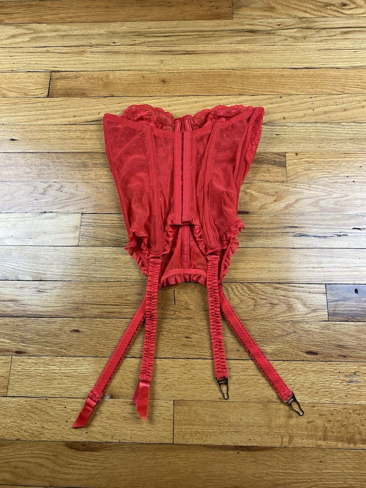 Vassarette Red Strapless Corset Size 22 inch pit 2 pit Material is Nylon beautiful condition see photos for measurements no marks no holes no stains All items are washed with none fragrant detergent.