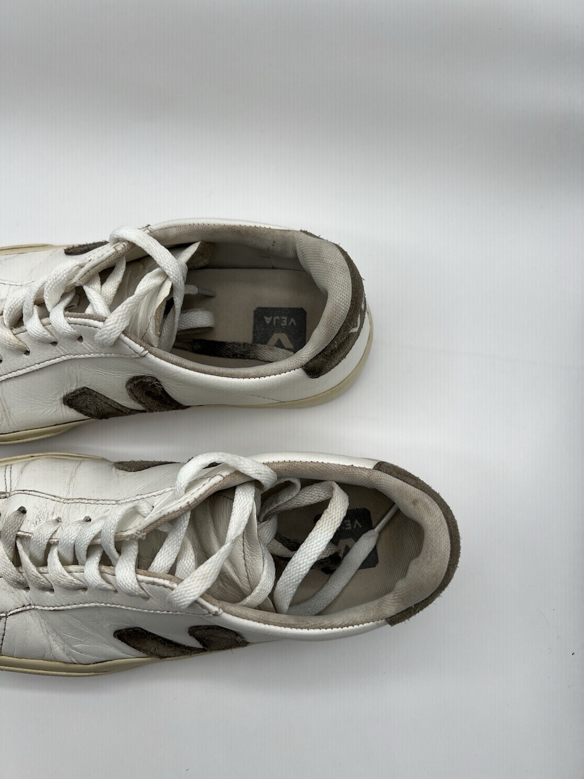Veja Campo Womens Chromefree Leather - White/Khaki - Size 8 Pre owned, shows signs of usage such as scuffing and creasing as well as dirt stains on laces and interior of shoes
