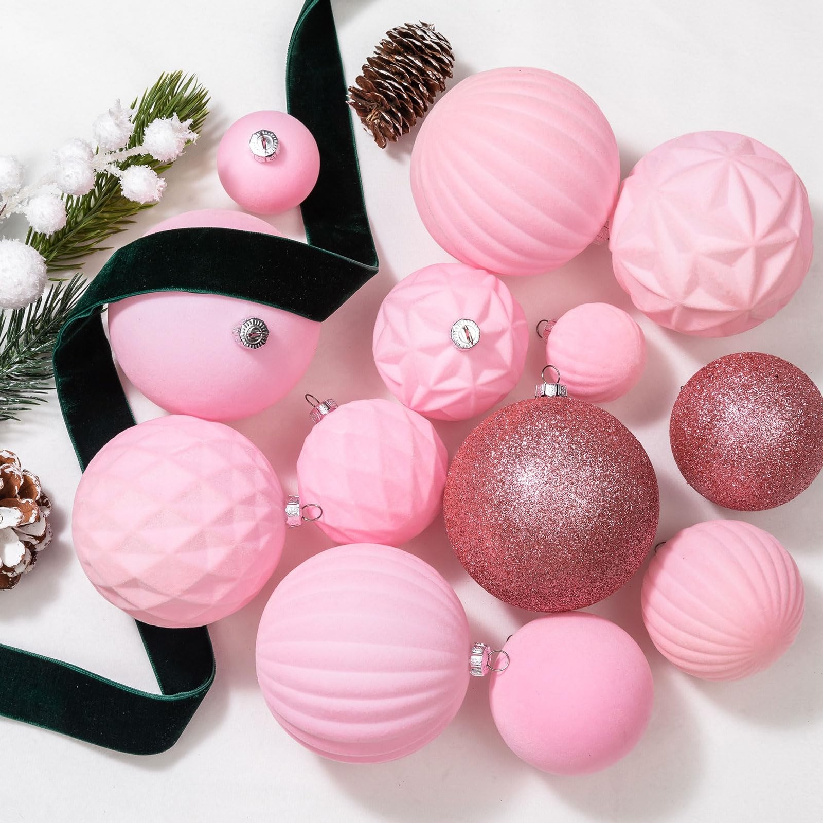 "36pcs Christmas Ornaments Set includes: Small Ball Ornaments(1.57""/40mm)x18pcs; Medium Ball Ornaments(2.36""/60mm)x12pcs; Large Ball Ornaments(3.16""/80mm)x6pcs; In Velvet Flocked and Glitter Finishes with 5 differents Styles. Available in 11 colors. Come with Metal Ornament Caps and Hanging Cord Shatterproof and Sturdy Unique Velvet Texures Vintage and Luxury Designs" Vintage & Exquisite Christmas Ornaments: Enhance your holiday decor with our 2024 exclusive Christmas collection of handcraft velvet flocked Christmas ornaments. This set offers three versatile sizes and a delightful range of color combinations. Craft a captivating Christmas display that embodies the festive spirit with this comprehensive set. Unique Velvet Texture: Our ornaments stand out with their unique velvet texture and classic pink christmas hues. Includes 18pcs small(1.57"/40mm), 12pcs medium(2.36"/60mm) and 6pcs large(3.16"/80mm)ball ornaments, the subtle elegance of these pieces makes them a versatile choice for any holiday theme. Shatterproof & Durable: Each ornament is meticulously crafted from sumptuous velvet textile and shatterproof polystyrene balls, seamlessly combining elegance with lightweight durability. Embrace the enchantment of handcrafted artistry and relish the allure of these ornaments without concerns of breakage. Metal Ornament Topper: Unlike others that use plastic ornaments caps, our Christmas decorations feature metal caps! With the delicate pattern on it, adds a touch of vintage flair to this Chrismtas ornaments set. Come with Hanging Cord: Our ornaments come ready-to-hang on a gold string. Hang them on your tree or suspended from ribbon, display tucked into your mantel and table decor. Beautiful accents as a bowl or basket filler. Minor color variations may occur due to individual monitor settings. These handcrafted ornaments bear unique distinctions in each piece, adding to their character and charm. Elevate your holiday decor with these versatile and sturdy ornaments, where elegance meets peace of mind.