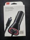 The Verizon Vehicle Charger with Dual Output is designed to fit universal micro USB devices. It has one port and provides a 5V voltage output. The charger is in black color and comes with a Micro USB connectivity option, making it compatible with various cell phones and devices. Unopened.