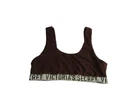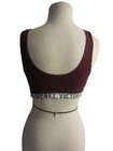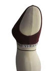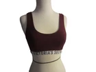 This is a women's Victoria's Secret brown cotton blend sports bra. It is size M and has a scoop neck. The bra is made of 89% nylon and 11% spandex and is machine washable.