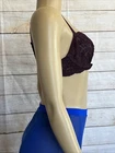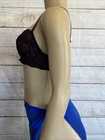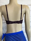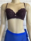 This Victoria's Secret bra is a purple unlined balconette style with floral lace and bow accents. It has a hook & eye closure, underwired cups, and adjustable bra straps for a comfortable fit. The material is polyamide, and it is a size 32D.