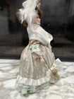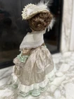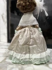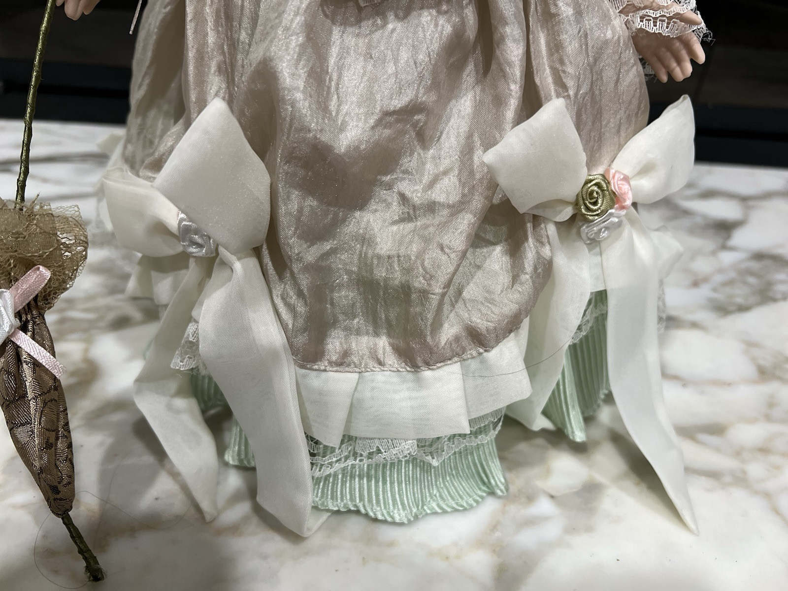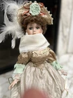 This vintage Heritage House porcelain doll is part of the Inspiring Women Series from 1991. Standing at 16 inches tall, the doll features curly brown hair, hazel eyes, and a light complexion. Dressed elegantly in a Ribbons & Bows Umbrella fashion theme, this collector's edition doll exudes a classic and timeless beauty. Perfect for all occasions, this antique doll is a lovely addition to any doll collection.