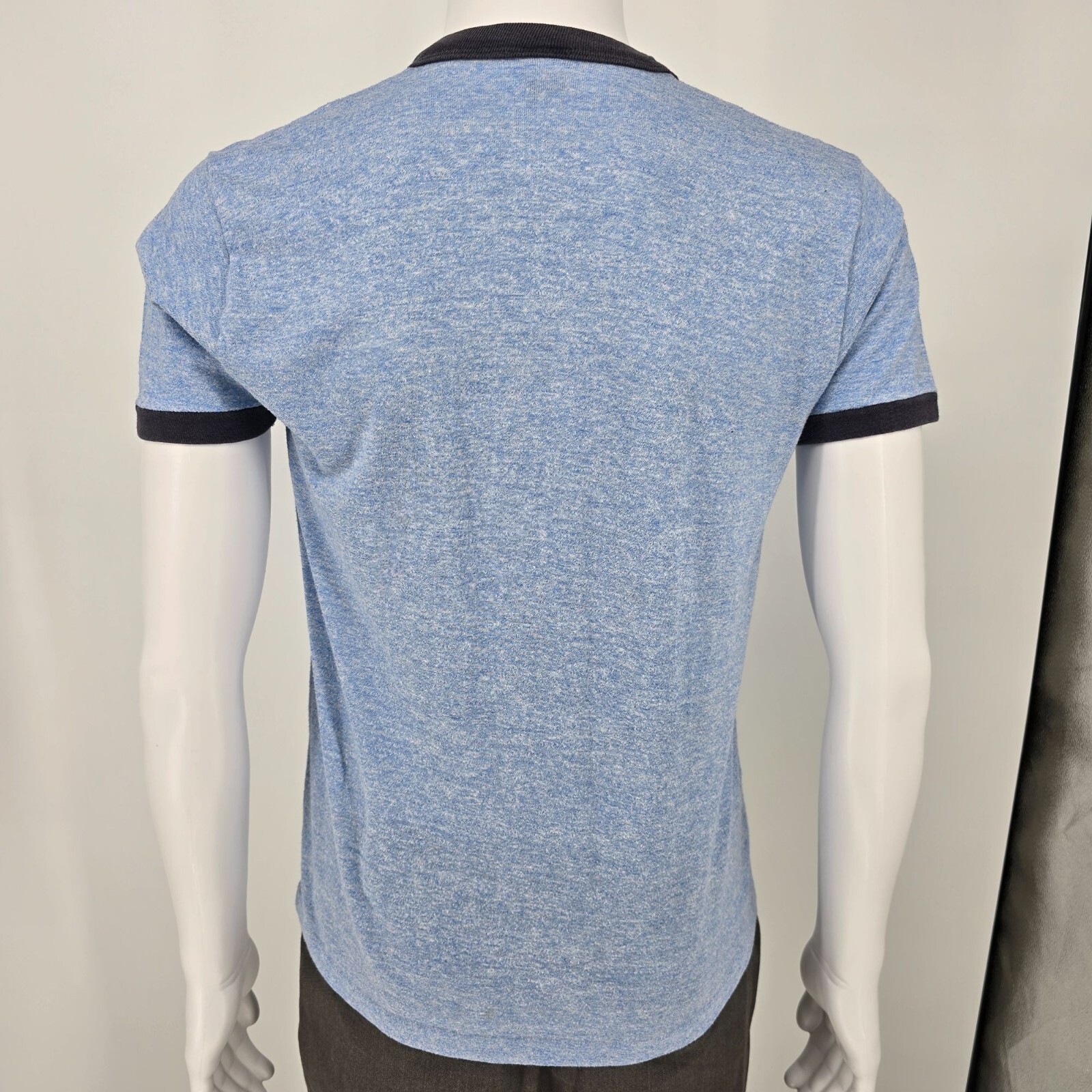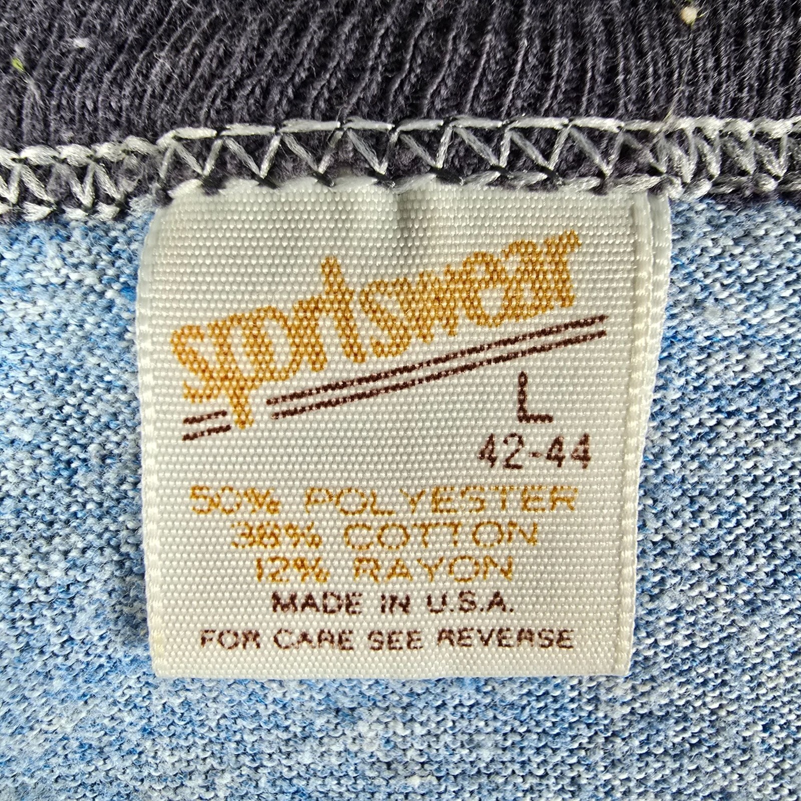 🔹 Item Details: Brand: Sportswear Material: 50% Polyester, 38% Cotton, 12% Rayon Color: Heather Blue Decade of Manufacture: 1980s (circa 1982-1983) Country of Manufacture: United States Notable Features: Single Stitch Hem, Ringer Tee 🔹 Condition Notes: Fair to good used vintage condition. Faint stain on chest to right of logo. Two yellow stains on front along bottom hem. Moderate fabric wear and pilling throughout. See photos. 🔹 Size Notes: Vintage Tag Size: Large (42-44) Modern Measured Size: Medium (38) 🔹 Measurements (Approximate): Chest (pit to pit): 38 inches Collar to Hem: 24.5 inches 🔹 Shipping & Returns: Ships worldwide from Lexington, KY. Ships within 3 business days of purchase. Returns accepted within 60 days for domestic orders and 30 days for international orders.