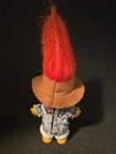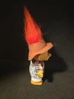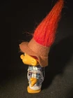 This vintage 1990s Russ farmer troll doll has red hair, brown eyes, and a medium complexion. The 6-inch boy doll is dressed in overalls and shoes. Made of hard plastic, it is an original Russ product from China. Perfect for collectors of troll dolls, this item is a nostalgic piece from the 1990s.