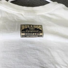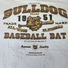 This vintage Bulldog Brand T-shirt features a striking baseball bat graphic. Made from 100% cotton, this 2XL shirt offers comfort and durability. • Vintage 1995 graphic T-shirt • Bulldog Brand baseball bat design • 100% cotton heavyweight • Preshrunk for consistent fit • Made in U.S.A. • Size: 2XL Small hole near graphic, slight discoloration at the bottom hem.