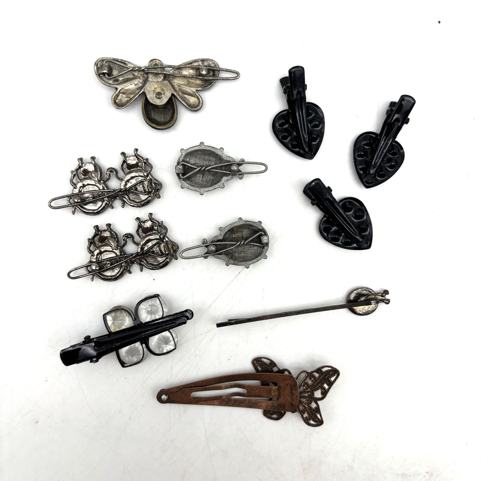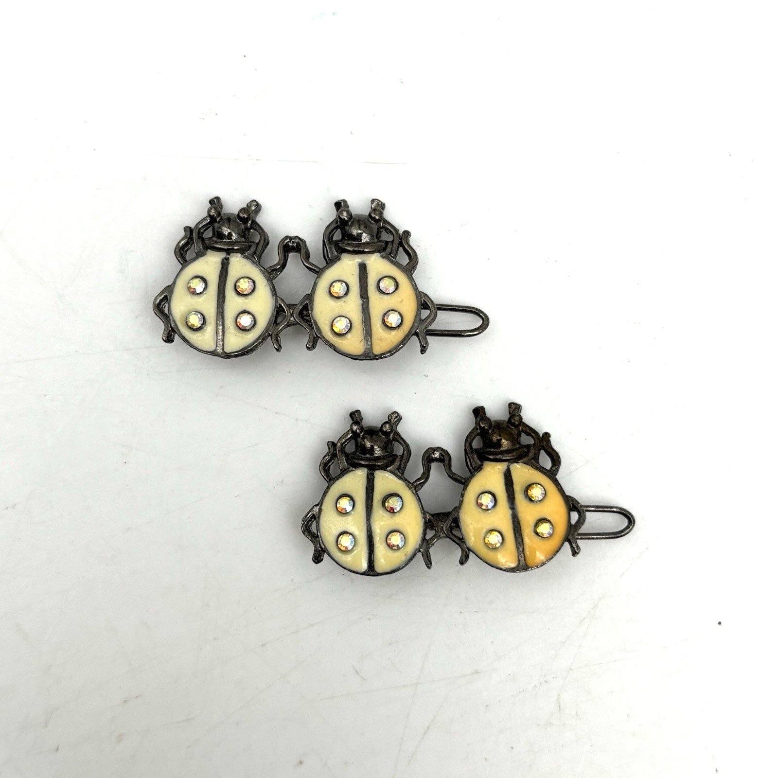 Lot of 11 Vintage 70s 80s Enamel Rhinestone Metal Ladybug Bee Insect Hair Barrettes Includes: (3) 1 1/4" Black Metal Enamel Rhinestone Heart-shaped Alligator Clips (2) 1.5" White Enamel Iridescent Rhinestone Double Ladybug Metal Barrettes (2) 1 1/4" Light Blue Enamel Blue Rhinestone Ladybug Metal Barrettes (1) 1 3/4" Black Enamel Brass Metal Iridescent Rhinestone Bee Barrette (1) 2.5" Brass-tone Metal Ornate Butterfly Snap Clip Barrette (1) 2.5" Gunmetal Red Enamel Ladybug Bobby Pin (1) 1 3/4" Black Metal Clear Rhinestone Flower Alligator Clip Excellent vintage pre owned condition. Very gently owned. Clean and from a smoke free home.