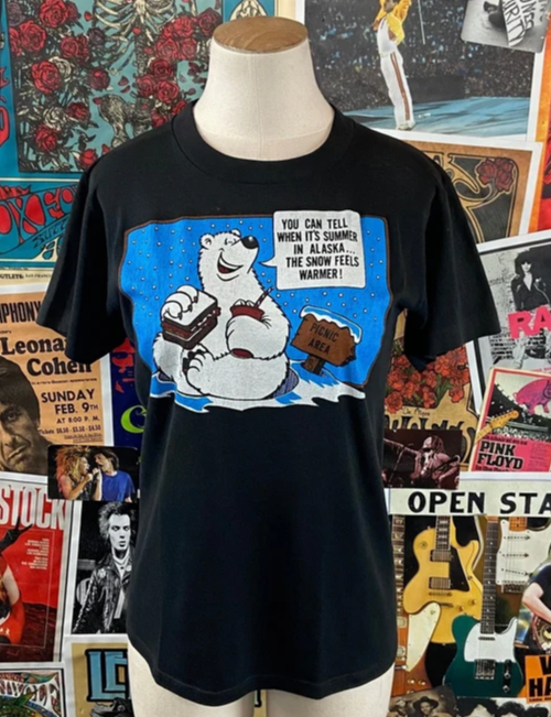 Soft vintage 1980s black short sleeve single stitch "You can tell when it's Summer in Alaska... the snow feels warmer!" polar bear graphic souvenir crewneck t-shirt. Tagged an adult size small, we estimate it to best fit an adult XS. See measurements. Made of 50% cotton and 50% polyester in the U.S.A. Is quasi thin, has light cracking on graphic and has minor bleach spots above graphic and on sleeve, but is in otherwise good, pre-owned condition. pit to pit -- 32.5" total length -- 23"