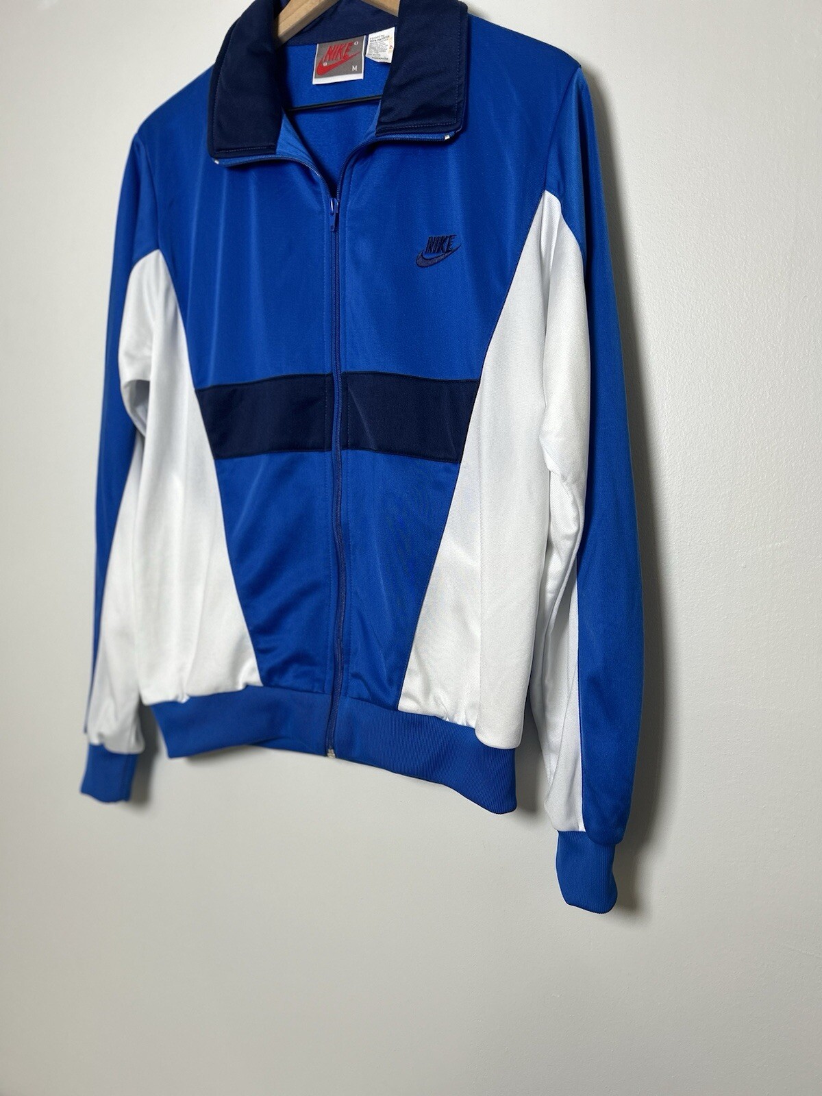 Vintage 80s Deadstock Nike Colorblock Track Jacket Full Zip Medium NWOT NOS VTG Brand New Old Deadstock Without Tags Condition No Flaws, Never Worn, Stored Properly Since Original Purchase! Tagged Medium Measures 21 in pit to pit 26 in length 100% Polyester Made in Singapore This vintage Nike Colorblock track jacket from the 80s is a must-have for any collector or fan of the brand. The jacket features a full zip closure, pockets, embroidered logo, and a colorblock design in a multicolor palette. The polyester outer shell, lining, and insulation material make it machine washable and suitable for all seasons. This mid-length jacket is perfect for casual occasions and can be worn for various activities such as tennis, cycling, volleyball, soccer, skiing, cross training, pilates, squash, wrestling, running & jogging, gym & training, track & field, walking, riding, weightlifting, dance, crossfit, and yoga. The regular fit and size type make it a great addition to any wardrobe.
