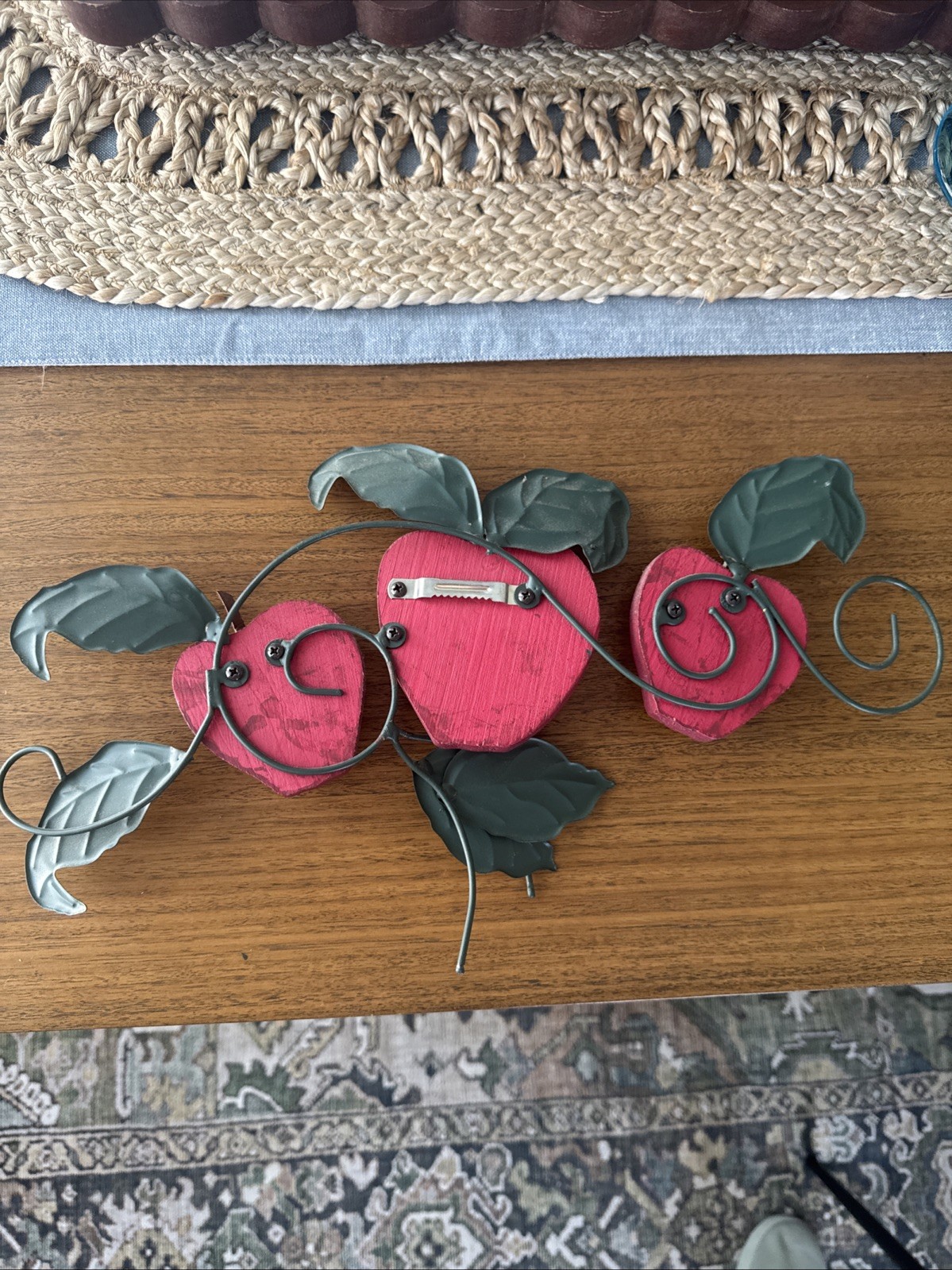 Add a charming retro touch to your kitchen with this vintage wooden and metal apple wall hanging. Featuring three red apples with green metal leaves and curling vines, it brings nostalgic farmhouse vibes straight from the 1980s or early 90s. Perfect for a country kitchen, cottagecore aesthetic, or vintage fruit-themed decor. • Hand-painted red wood apples • Embossed metal leaves and wire scroll detail • Sturdy hanging hardware attached • Approx. 16” wide x 9” tall • Vintage pre-owned condition with some wear and patina (see photos) This piece is a lovely example of nostalgic country decor and would look great in a cozy kitchen or vintage-themed gallery wall.