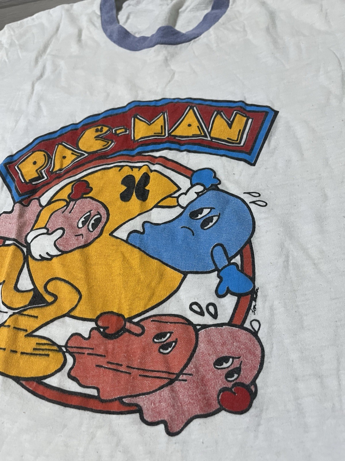 Embrace the nostalgia of the 80s with this classic Pac-Man ringer tee from Hanes. Crafted in 1981, this vintage shirt showcases the iconic graphic that captures the essence of the era's video game craze. Offered in a versatile white color, the short-sleeve design is perfect for casual outings or adding a retro touch to your modern wardrobe. This unisex tee is made from a comfortable blend of cotton, ensuring a soft feel against the skin. Designed to fit a size medium (Men's) or a size large (Women's), it features a timeless ringer style that was all the rage in the decade. Whether you're a collector of vintage apparel or just love the look and feel of 80s fashion, this shirt is sure to be a cherished piece.
