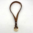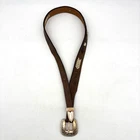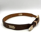 Vintage 90s 3D Women's Western Belt Made in USA Style Code: 603 Brown Genuine Leather White Whipstitch Accents Three 1/2" x 3/4" Oval Rose Gold-tone Floral Conchos Rose Gold-tone Floral Engraved Interchangeable Buckle Women's Size 28 Refer to measurements below to ensure accurate fit before purchase! Buckle: 2" long 2" wide Belt Measurements: 1 1/8" wide 3/4" wide at ends 33" full length from buckle prong to belt end 25" smallest hole 29" largest hole 5 holes total Great vintage pre owned condition. Very gently owned. No rips, tears, stains, holes or other notable flaws. Clean and from a smoke free home.