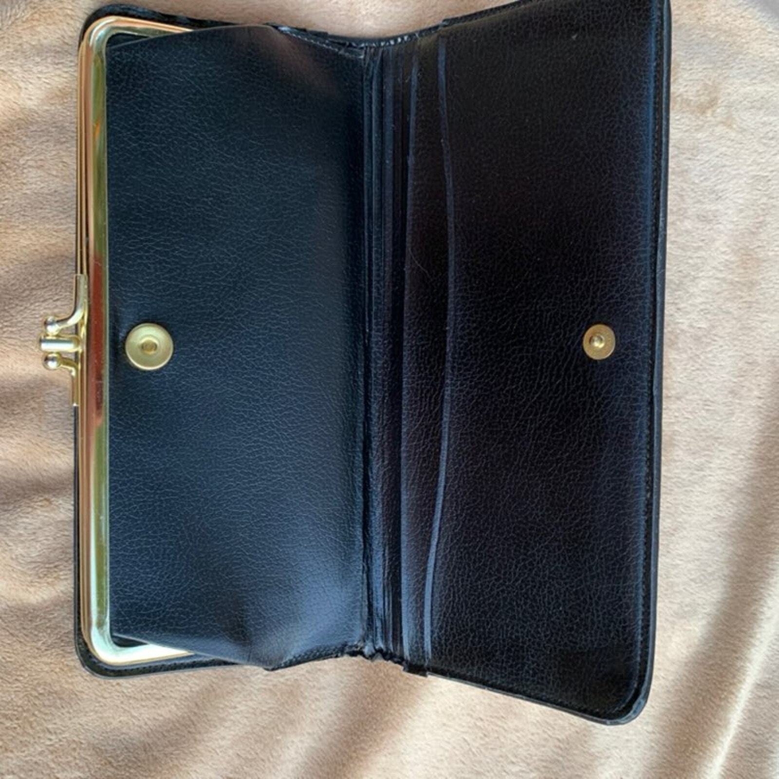 Vintage Baronet Wallet Navy with brass clasps & diamond-shaped studs Double clasp center has clear plastic divider, 2 full-length slots on either side Exterior has no notable flaws, interior has wear at gold in the middle - see photos & feel free to contact me with questions