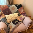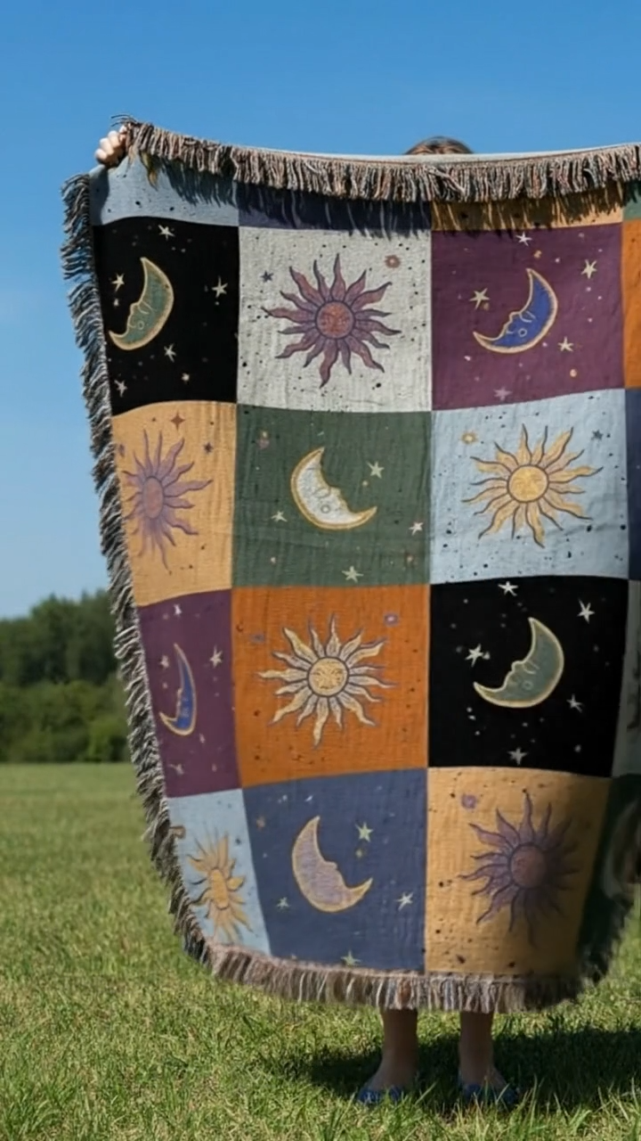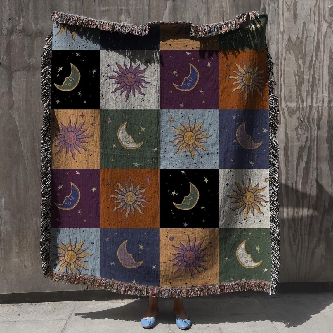 Embrace warmth and style with our 100% cotton Woven Blanket, featuring a stunning boho sun and moon checkerboard design. This blanket combines vintage celestial charm with modern craftsmanship, making it the perfect cozy addition to your home. It is versatile and beautifully crafted and can be used as a throw, wall tapestry, or decorative piece, adding a unique bohemian touch to any room. This high-quality, soft fringed blanket comes in three versatile sizes: 52” x 37”: Great for small spaces or to accent a gallery wall. 50” x 60”: A bold centerpiece that adds character to living rooms or bedrooms. 60” x 80”: A large, eye-catching wall tapestry that can transform an entire wall or as a full queen blanket for your bed. *** If you would like the horizontal version of this woven blanket, please reach out to me via Etsy Messages. I’d be happy to create a custom order for you! *** Each blanket is woven (not printed) for long-lasting quality, making it a unique piece for bohemian decor lovers. Wrap yourself in softness, or gift it to someone special as a housewarming, Christmas, or birthday present. Whether used for warmth, meditation, wall decor, or to add character to your space, this blanket will be a treasured item in any home.