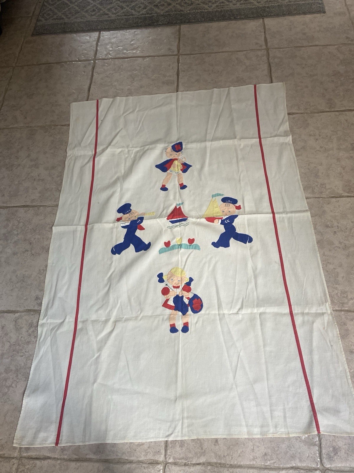 Vintage blanket, handmade by someone with adorable little girls and boys in US Navy, clothing and sailboats. Very old blanket and fabulous condition, considering its age. Has some very slight yellowing along the edges and a few tiny spots but this is a fabulous one of a kind piece. A great family heirloom. About 40 inches wide 55 inches long.