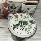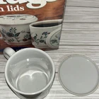 Vintage Circa 1998 NIB NOS Tea Mugs Cups With Lids Floral Porcelain Set Of 4 These Are New The Box Has Some paper missing and some damage but cups are all in new condition have never been used made in Georgia USA Very Cute Set