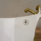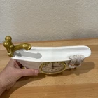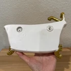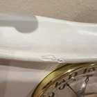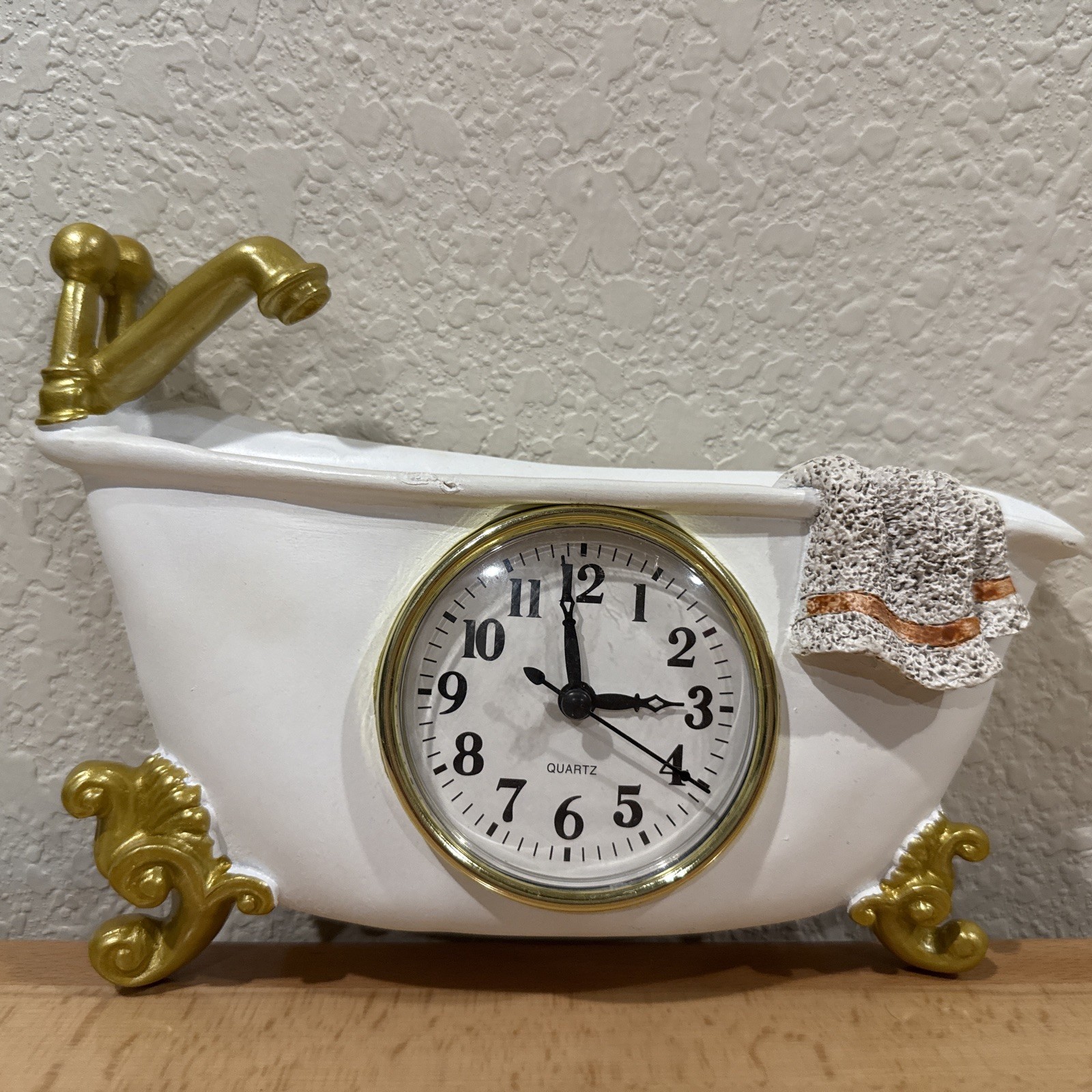 This Claw Foot Bathtub Bathroom Wall Clock is a charming and unique addition to any space. The white and gold color scheme, along with its antique style, gives off a kitschy Americana vibe. Measuring 7 inches in height and 9 inches in length, this battery-powered clock is perfect for adding a touch of whimsy to your bathroom decor. The claw foot bathtub shape and hanging wall clock design make it a standout piece in any room. Please notice in pictures there is a chip at the top of tub.