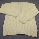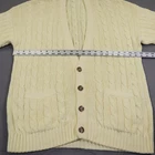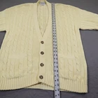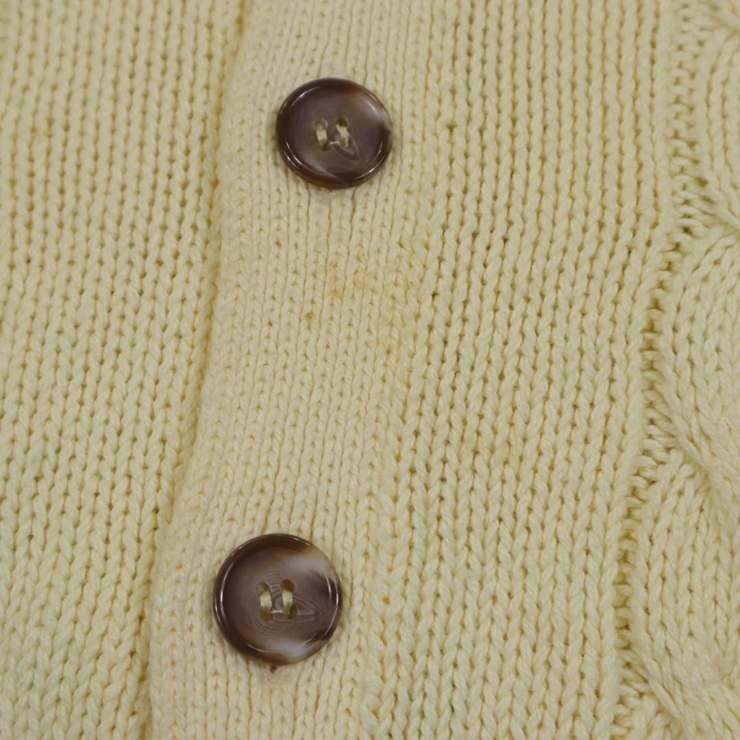 Brand: Coxmoore of England Item: Mens button-front cardigan sweater with a deep V-neckline in a classic cable knit pattern. Color: Pale yellow Size on tag: Large (L) Material: 100% cotton (per tag) Country of origin: Made in Hong Kong Design details: Cable knit front and back, ribbed cuffs and hem, front patch pockets, brown marbled buttons, soft midweight knit. Era: Likely vintage 1980s–1990s based on tag style and Hong Kong manufacturing.