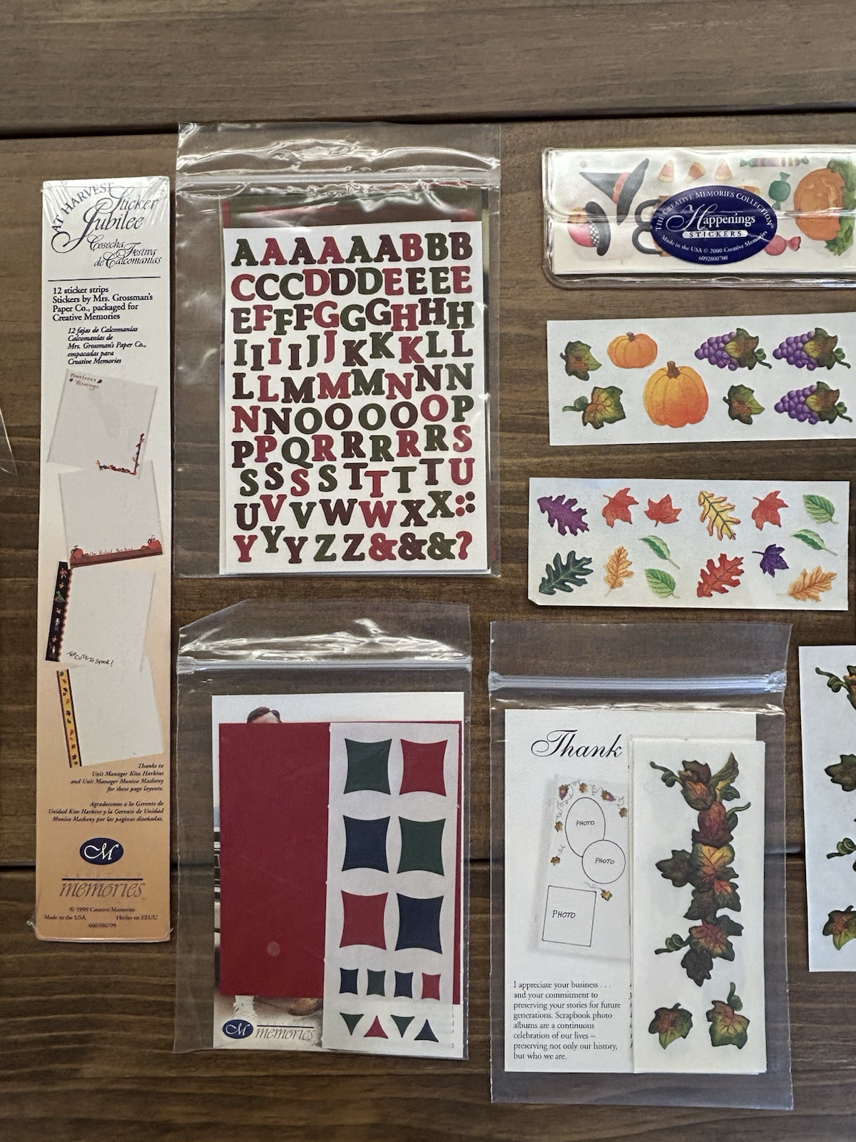 Creative Memories Stickers Die Cuts Lot Fall Autumn Harvest Camping . Condition is New. Includes various camping stickers (2 strips are partially used - see photos), acid free paper and die cuts; 2 - new, unopened specialty sticker packs “At Harvest Sticker Jubilee” and “Happenings”; 2 - new “Thank you” sticker/die cut packs; 1 - “Congratulations” sticker/die cut pack. Please see photos for complete details of items that are included.