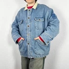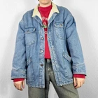 Vintage denim trucker jacket in a medium blue jean wash. Featuring faux sherpa pile fleece lining & contrasting corduroy collar. With twin chest pockets & hip pockets. Good condition with minor wear including small mark on front - could be removed with effort. Labelled size XL or suits smaller oversized, measurements below Length: 30 inches Pit to pit: 28 inches £3 UK P&P 💌 Model is 5’9 and a men’s medium Please get in touch for more measurements All items are second-hand so please expect small signs of wear - any major flaws will be noted