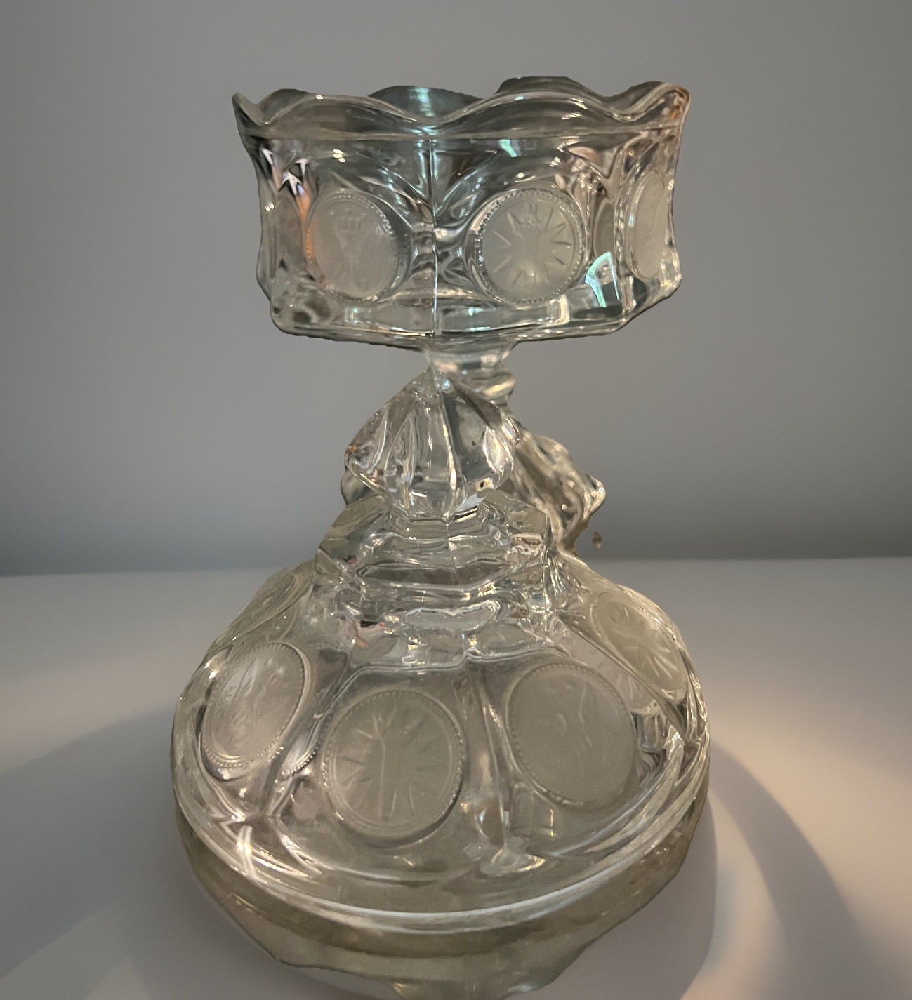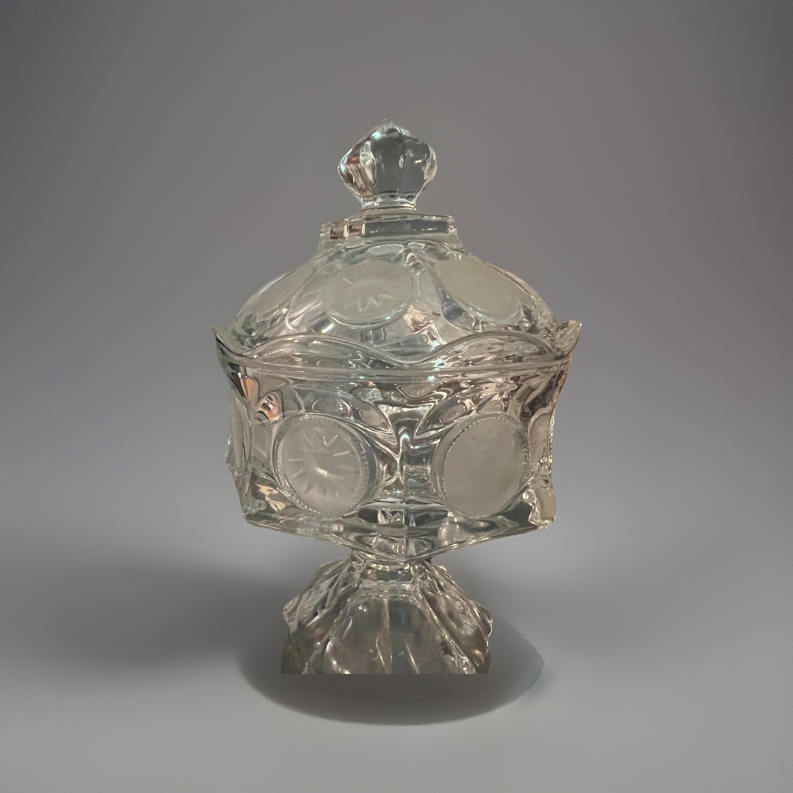 Material: Glass Production Style: Elegant Glass Brand: Fostoria Style: Coin Color: Clear Vintage: Yes Product Line: Coin Pattern: Coin Type: Candy Dish