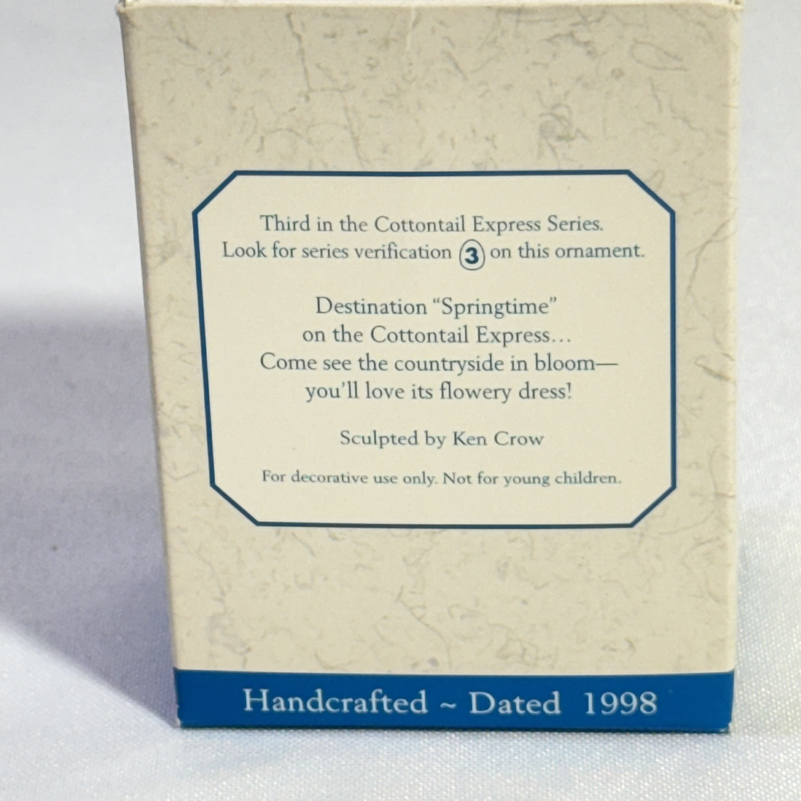 Add some vintage charm to your Easter decorations with this Hallmark ornament from the 1998 Cottontail Express Passenger Car Series #3. The colorful resin ornament features a cute Easter theme and is perfect for adding to your spring decor. The small size of this ornament makes it easy to display on your tree or in your Easter basket. This is a great addition to any collection and a must-have for fans of vintage Hallmark ornaments. Celebrate Easter with this charming and timeless piece. Excellent condition
