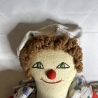 This vintage handmade cloth doll is a rare folk art piece featuring a Clown character with curly brown hair and green eyes. The 18-inch doll has a light complexion and wears a red outfit, embodying a whimsical and charming aesthetic. With its original design and Raggedy Andy inspiration, this unique doll is a special addition to any collection of dolls and folk art items.