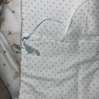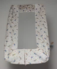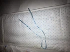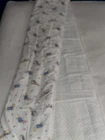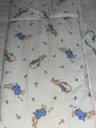 Handmade Peter rabbit crib bumper pad in excellent condition no rip stains or tears. Item has recently been laundered in gentle cycle and comes from a smoke-free pet free environment. The bumper pad attaches to the crib railing with cloth ties. Most of the ties are 100% perfect. There are only two blue satin ties that have become frayed from washing. See pictures. This is easily fixed by tacking a piece of satin ribbon to replace it. The ties are still usable. Inside the bumper pad is a soft foam sewn insert that goes all the way around. Fits to a standard crib.