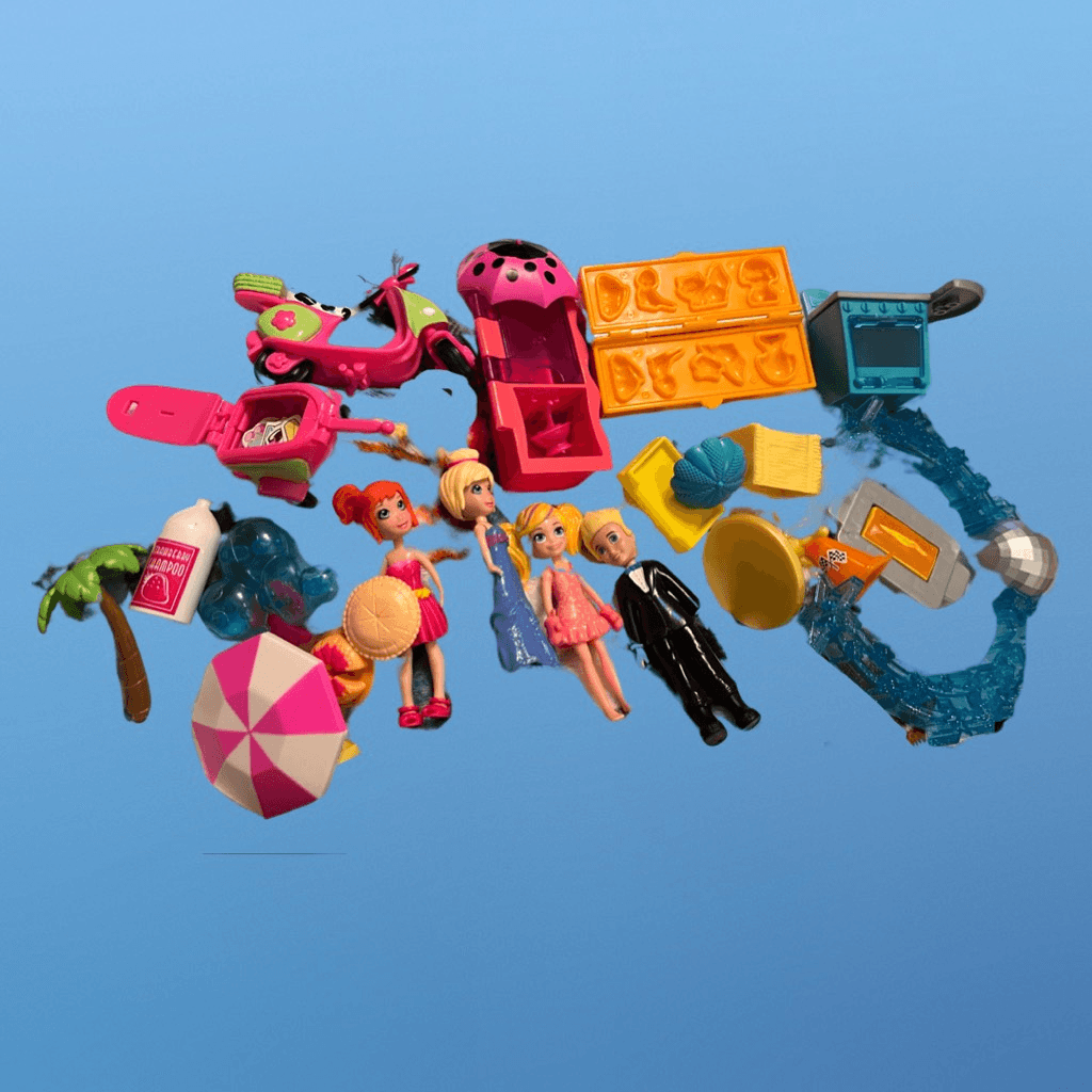 Large lot of Mattel Polly Pocket Some Vintage 15 Dolls Scooter & Trailer 80+ clothes and accesories Cardboard accessories Stickers Playdoh Mold Plastic Case Great Shape Clean Smoke free home
