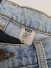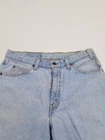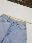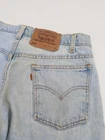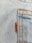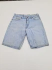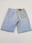 This vintage Levi's shorts for men in size W34 features a classic blue color with a straight cut and orange tab detail. Made from cotton denim material, these distressed shorts have a casual style perfect for summer and spring. The flat front design includes a zip closure, belt loops, and pockets for convenience. The retro feel of these cut-off shorts adds to their appeal, making them a stylish choice for a laid-back look.