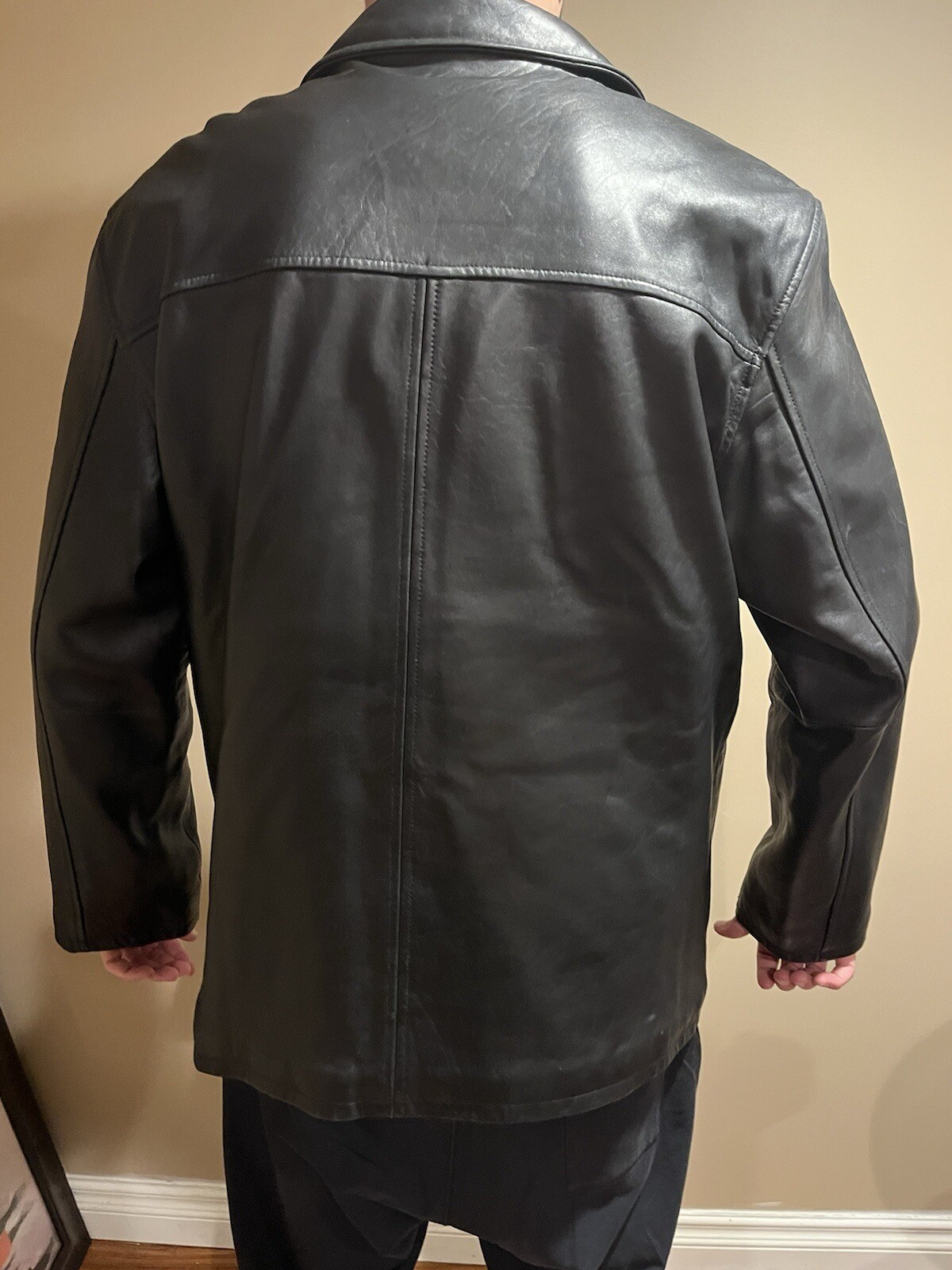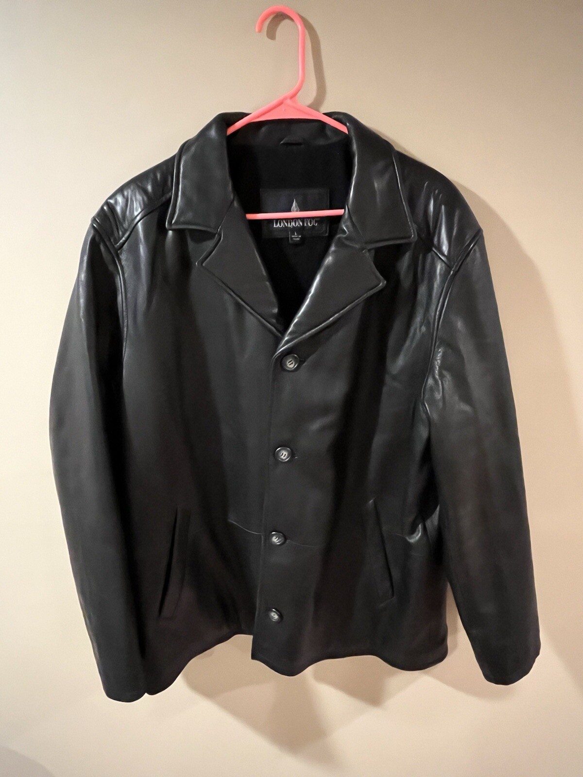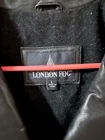 Elevate your style with this vintage-inspired London Fog black leather jacket. Crafted with high-quality leather and featuring a quilted lining, this bomber-type jacket is perfect for casual occasions. The jacket has a full zip and metal snap closure, along with an elastic waist and soft shell fabric, making it a comfortable and stylish choice for the fall and winter seasons. The jacket also features several pockets, shoulder pads, and a packable design, making it practical for everyday wear. The mid-length coat is perfect for men who want to make a statement without sacrificing comfort. Own this London Fog jacket today and add a touch of sophistication to your wardrobe. Very good condition