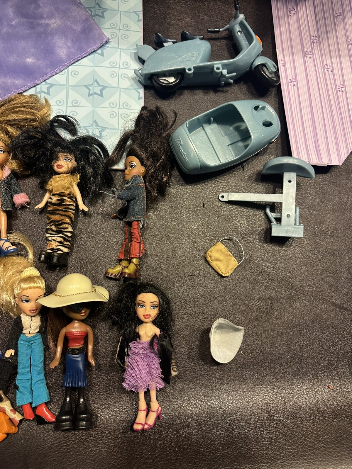 In used condition. Dolls have okay wear, scuffs, matted hair. Not sure if every thing is bratz brand. The scooter does not have all the parts. The house has dents and paint missing. Please see pictures. Comes with everything in pictures.