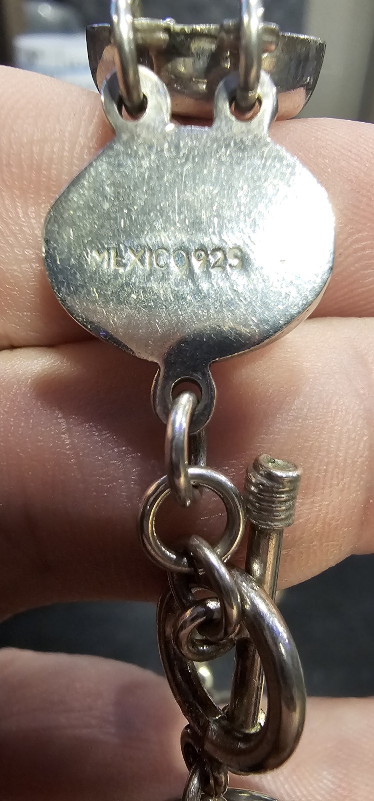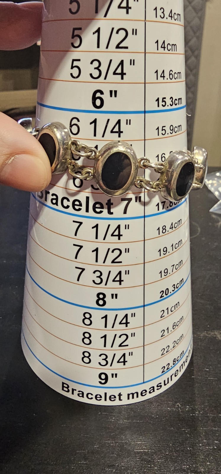 ✨ Vintage Mexican Sterling Silver Black Onyx Panel Bracelet – 36g – Classic Taxco Style ✨ A beautiful vintage Mexico 925 sterling silver panel bracelet featuring bold oval black cabochons set in smooth polished bezels and connected with double links. This design is a classic Taxco-style Mexican modernist bracelet known for its clean lines and substantial weight. The bracelet measures 7 inches and weighs an impressive 36 grams, giving it a solid and luxurious feel on the wrist. One cabochon is currently missing, making this a perfect restoration opportunity or a great piece for someone who works with jewelry repair or stone setting. Replacement stones for this style are inexpensive and easy to source. Even as-is, the bracelet presents beautifully and retains strong vintage character. Details • Metal: Solid Sterling Silver (.925) • Marked: Mexico 925 • Weight: 36 grams • Length: 7 inches • Stone: Black Onyx / Black Cabochon style • Era: Vintage (likely 1970s–1990s) • Closure: Toggle clasp • Condition: Good vintage condition with one missing cabochon Why Collectors Love These Mexican sterling jewelry—especially Taxco-style pieces—is highly collectible for its bold modernist designs and heavy silver construction. These bracelets layer beautifully or make a statement piece on their own. Condition Vintage pre-owned condition with normal wear and patina. One stone setting is empty (see photos). Bracelet is otherwise structurally solid. Shipping Carefully packaged and shipped securely. SEO Tags / Keywords vintage mexican bracelet mexico 925 bracelet taxco sterling bracelet sterling silver panel bracelet onyx sterling bracelet vintage onyx bracelet mexican silver jewelry 925 mexico jewelry taxco style bracelet heavy sterling bracelet black onyx sterling bracelet modernist silver bracelet vintage silver panel bracelet